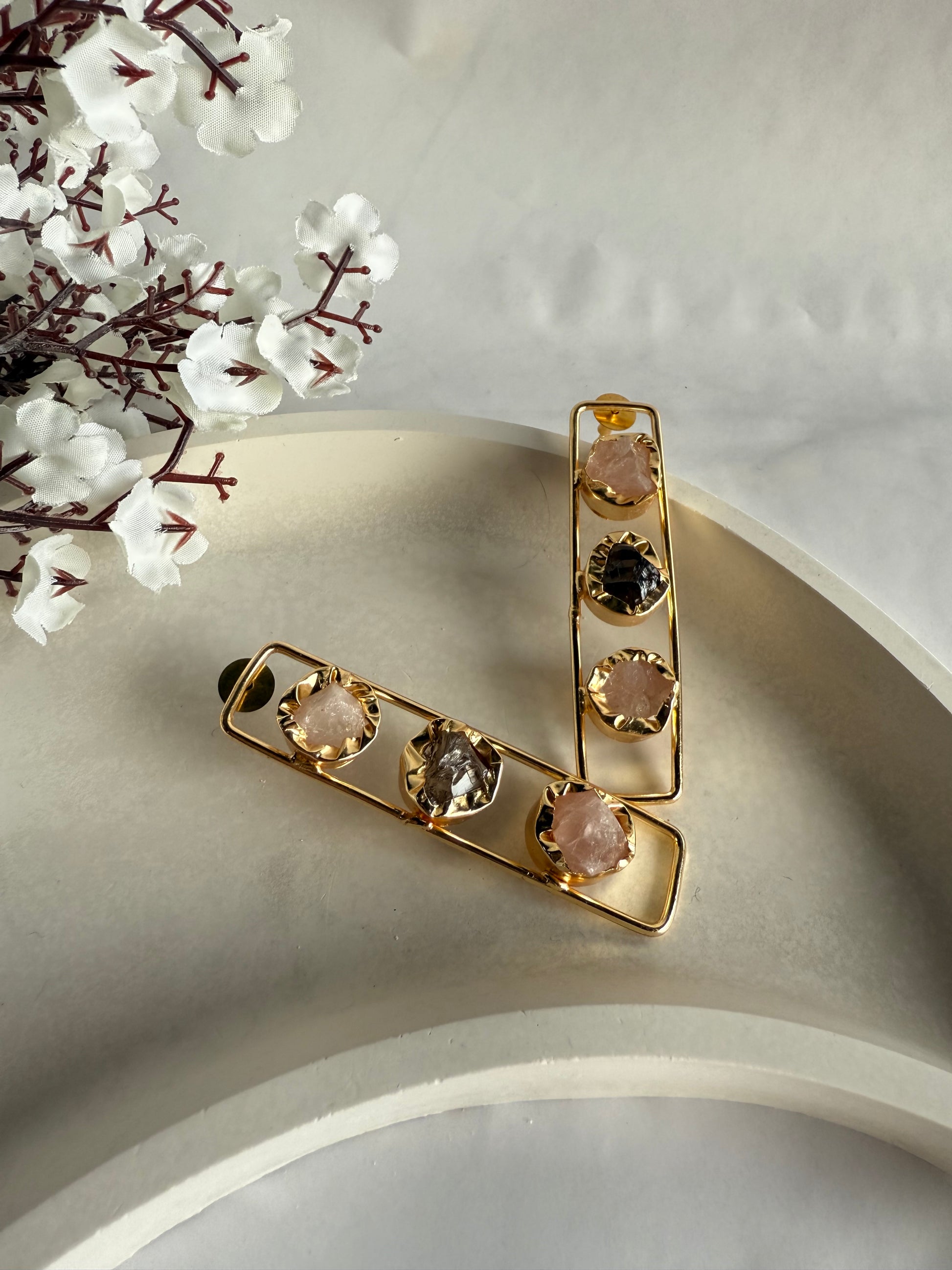 The Aurora Bar Earrings feature a sleek rectangular golden frame set with raw semi-precious stones in earthy tones. Their structured yet artistic design makes them the perfect balance between minimalism and statement jewellery.