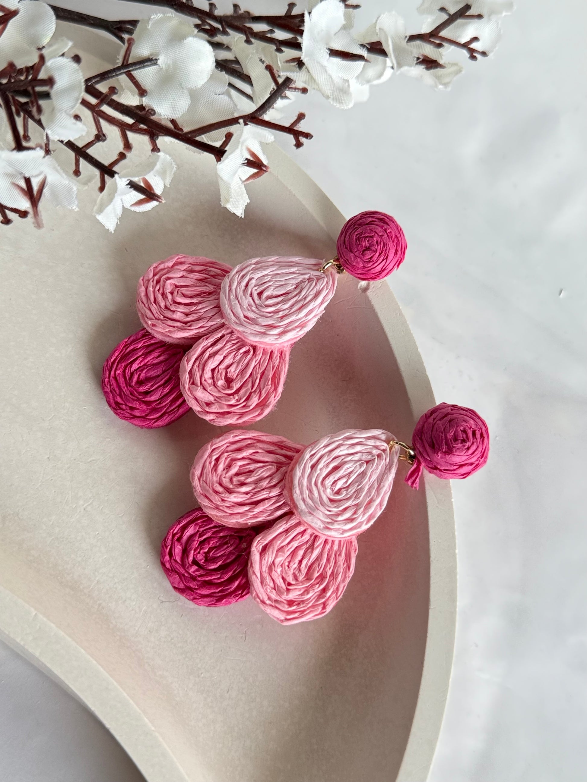 A playful yet chic design that celebrates handcrafted beauty. These earrings are crafted with layered pink tones in petal-inspired forms, creating a bold and vibrant accessory perfect for adding a pop of color to your look.