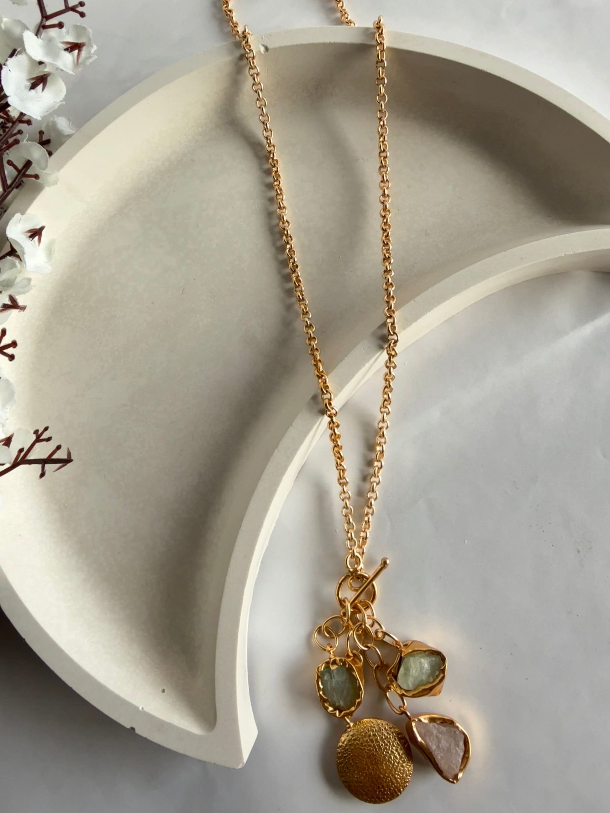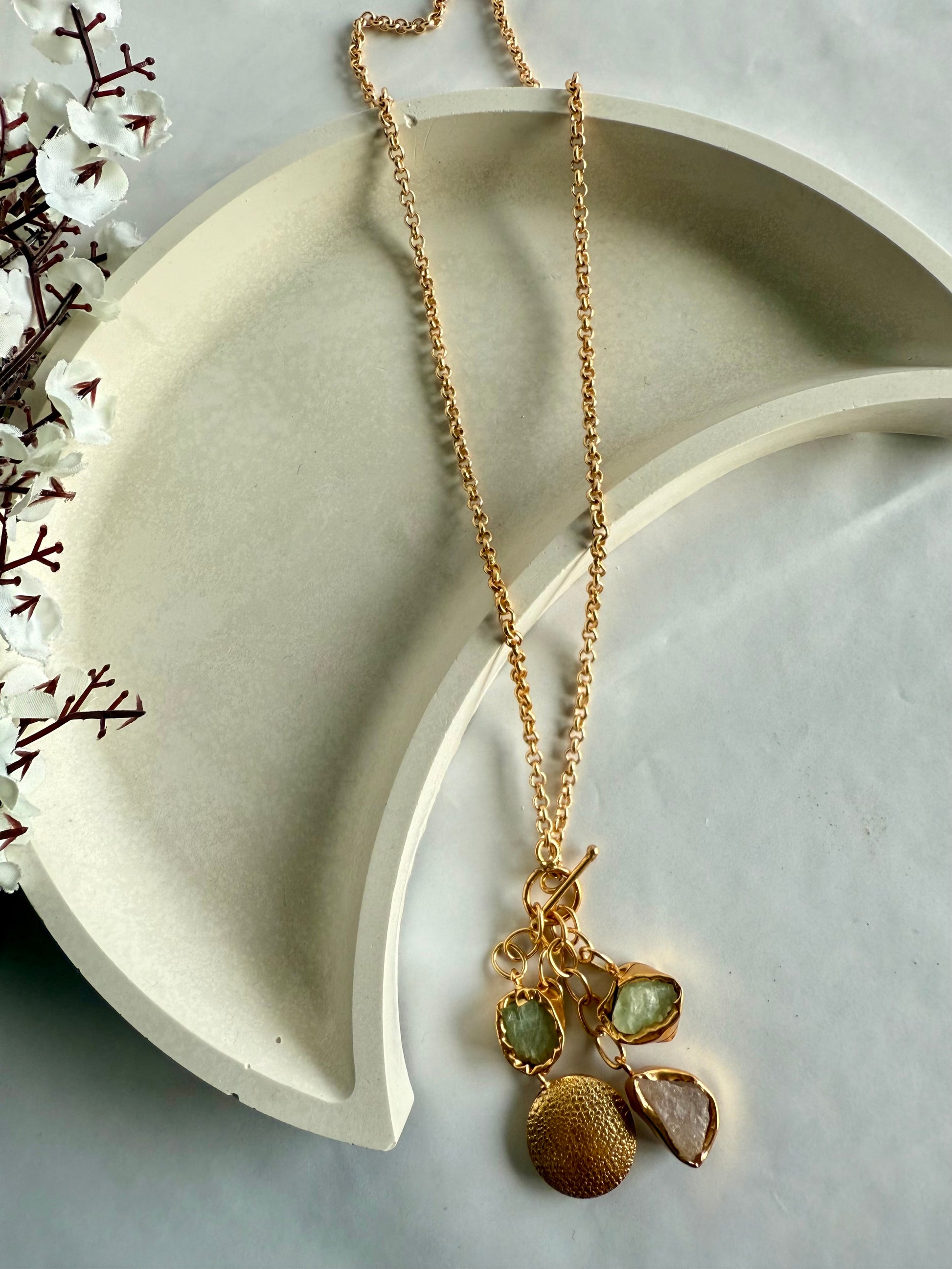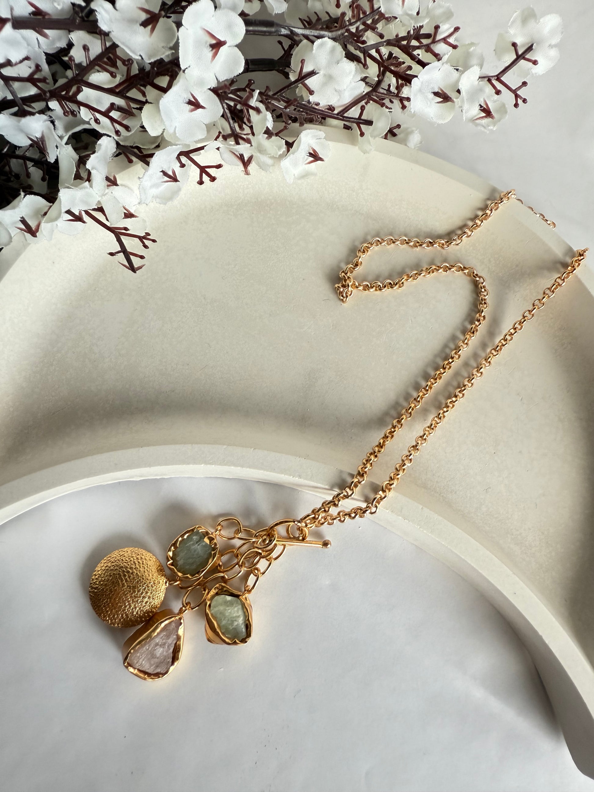 Elevate your jewellery collection with this statement bunch pendant chain, crafted with a unique mix of textures and semi-precious stones. The design features a bold golden textured disc paired with natural stone charms in soft green and blush tones, all set on a sleek golden chain.