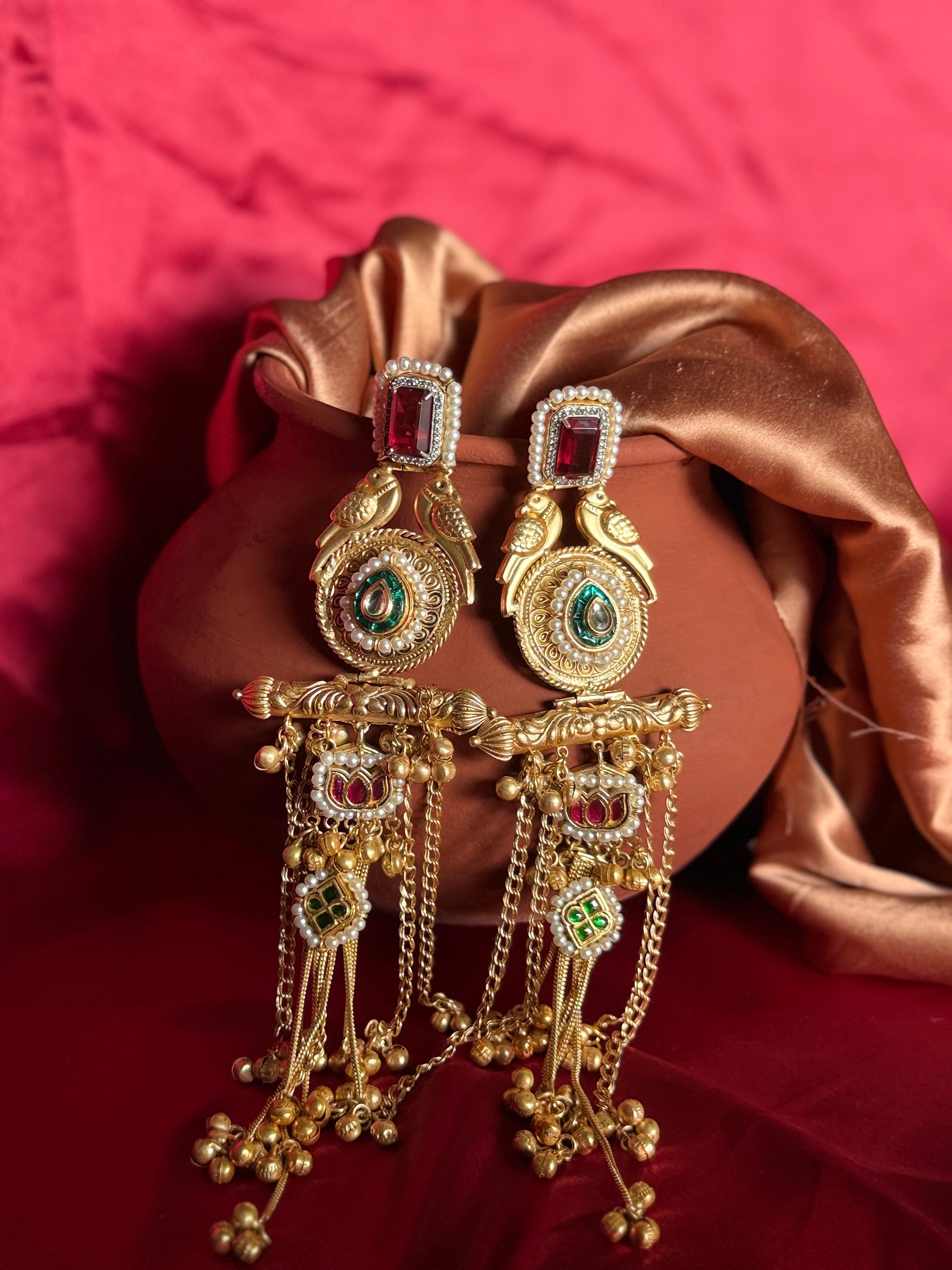 Embody the splendor of royal artistry with Devyani Darbar Earrings, an heirloom-inspired masterpiece that blends tradition with grandeur. These earrings feature deep ruby-red stones framed with pearls, bird motifs symbolizing grace, and intricate kundan detailing. The design cascades into delicate chains adorned with multicolor lotus and geometric enamel accents, finished with ghungroo drops that create a melodious charm.