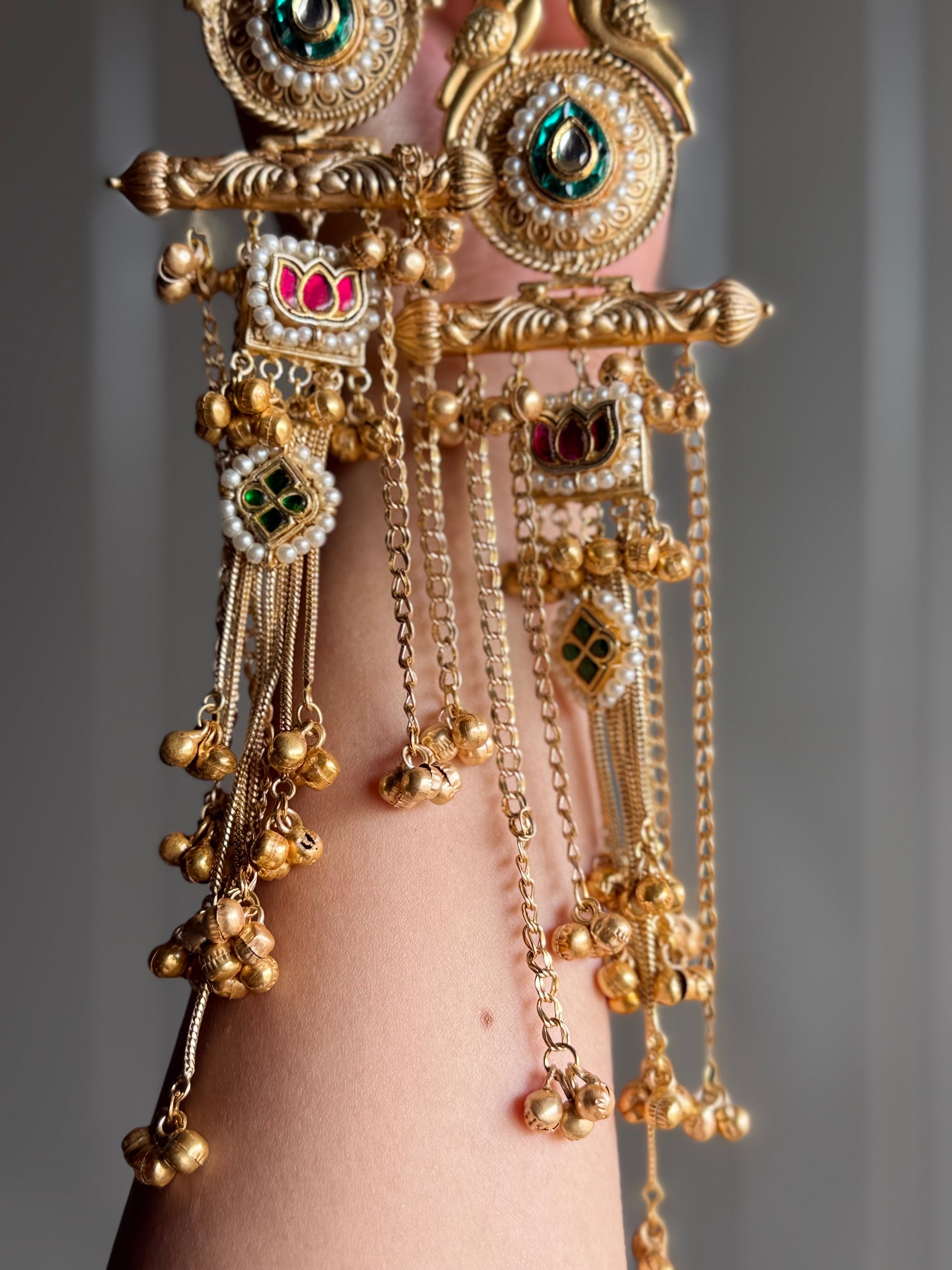 - Layered cascading chains with ghungroo drops for elegant movement.