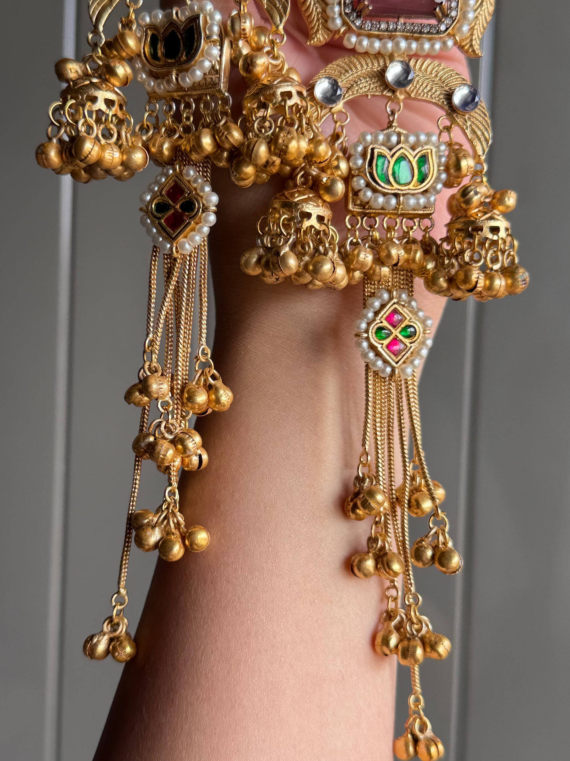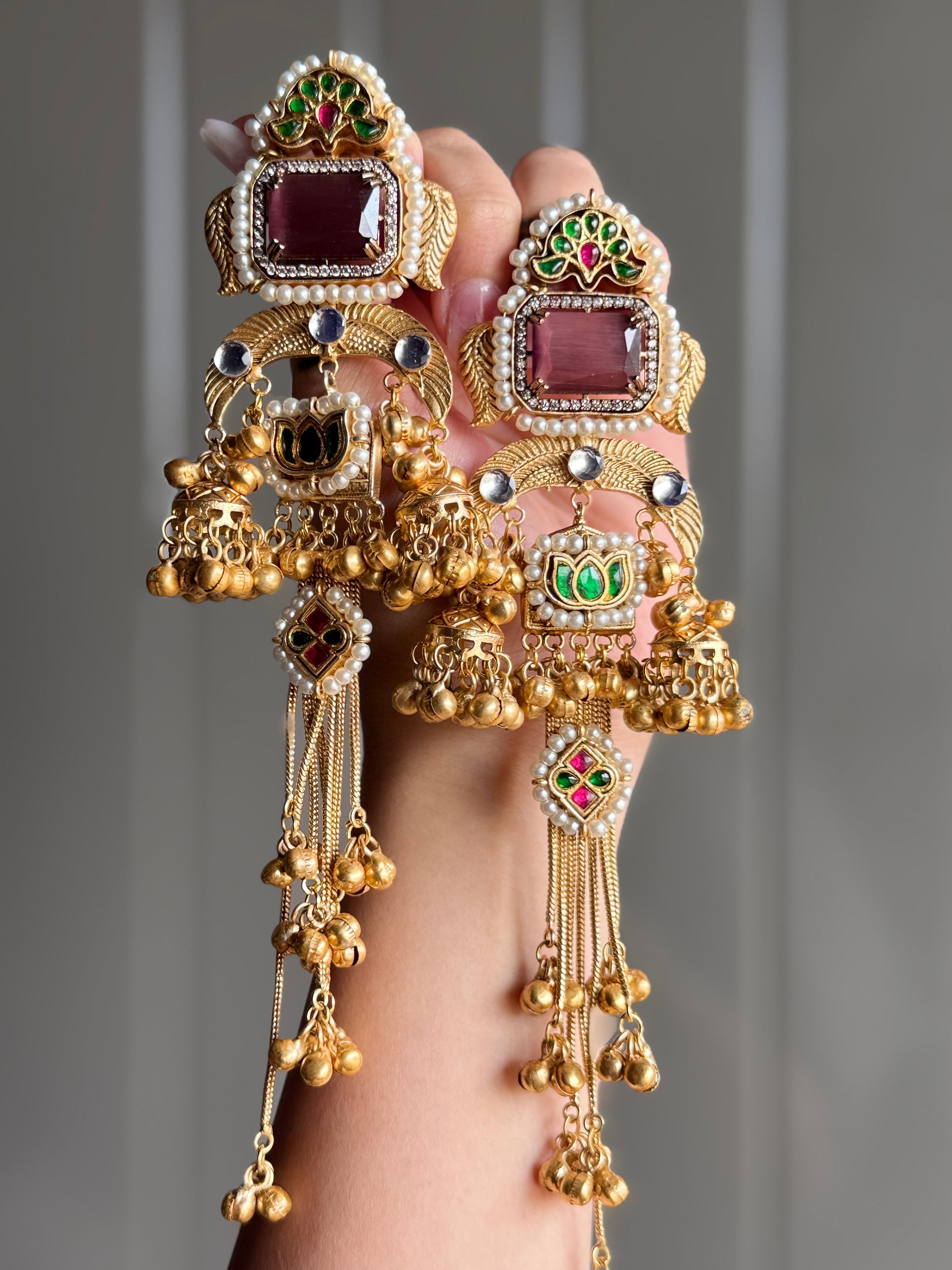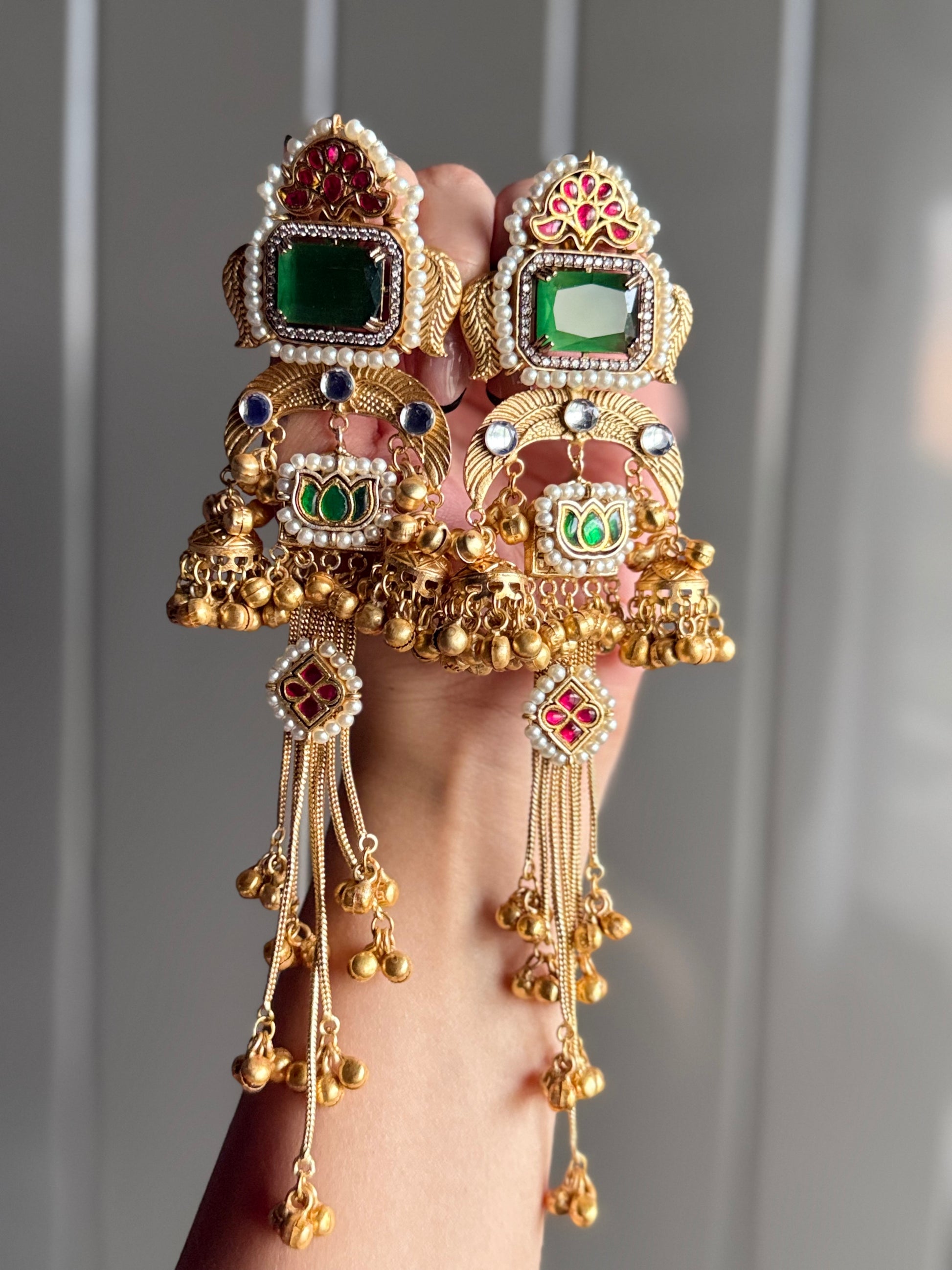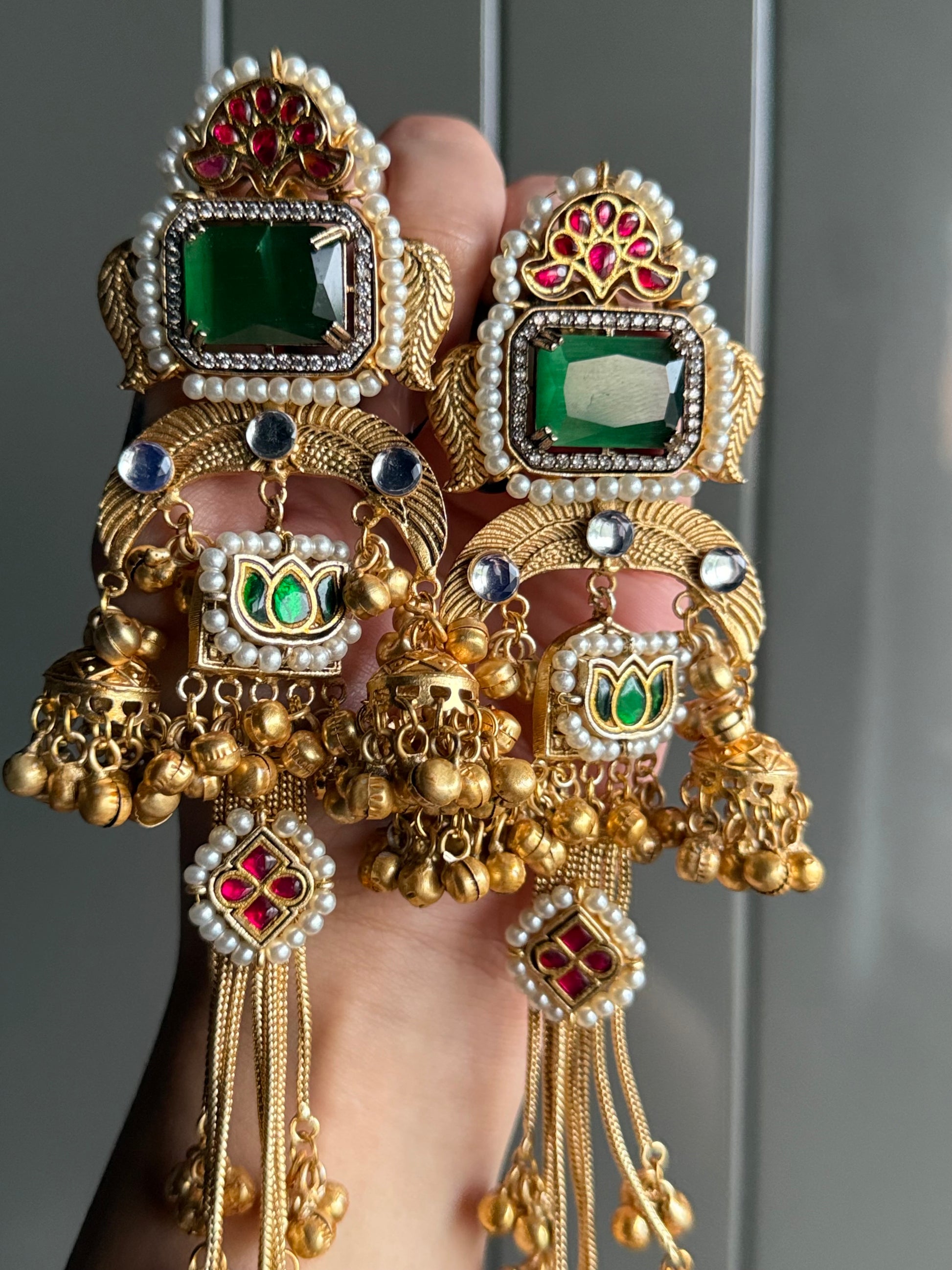 Unveil timeless grandeur with the Lotus Majesty Earrings. These regal earrings are adorned with a striking green gemstone centerpiece framed in pearls and ruby-toned detailing. The lotus motif adds a divine elegance, while the crescent design and intricate enamel work elevate their traditional charm. Cascading golden ghungroos and pearl-studded danglers bring movement, grace, and royalty together in one masterpiece.