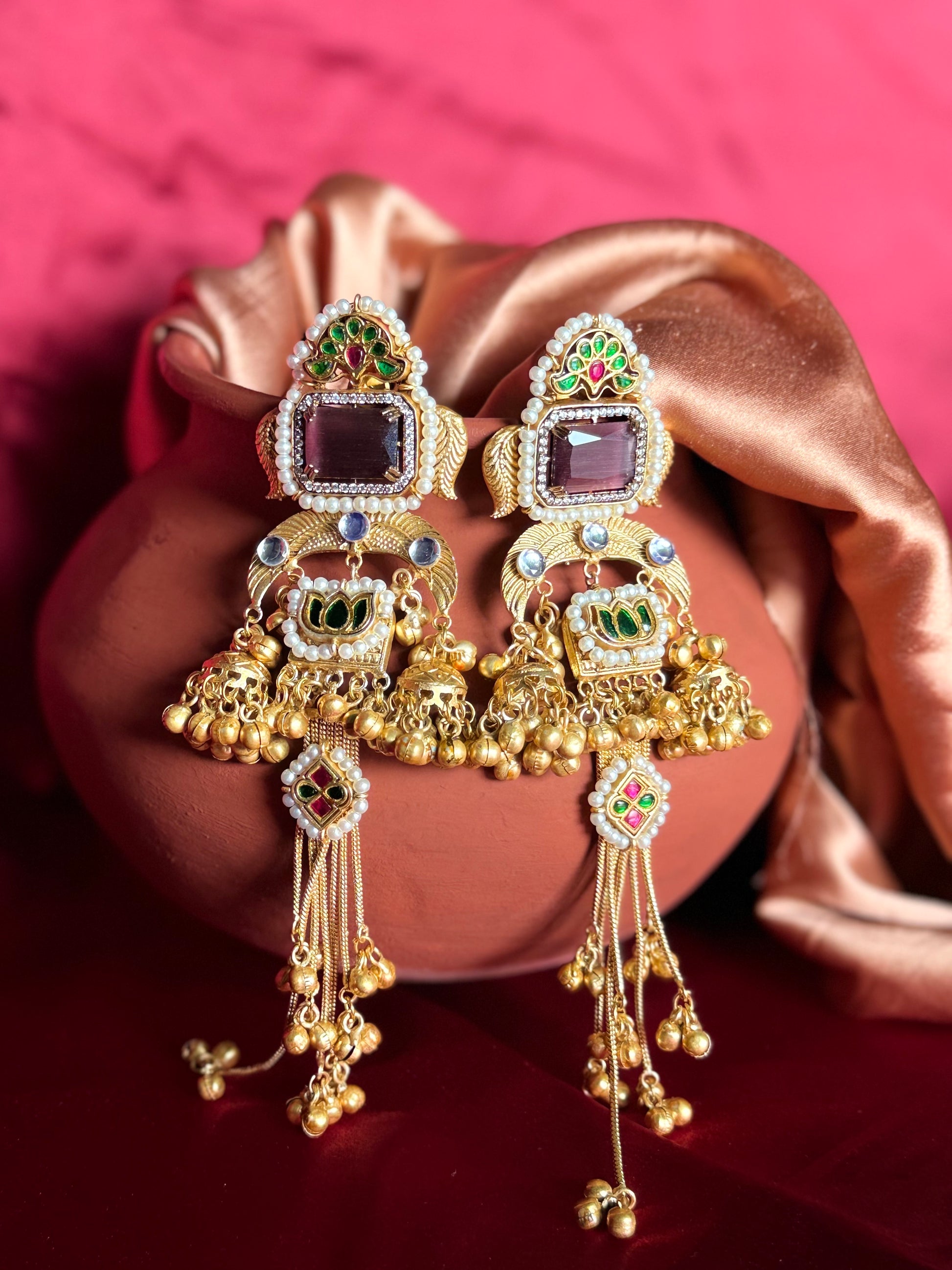 - Multi-layered ghungroo danglers add drama and grandeur.