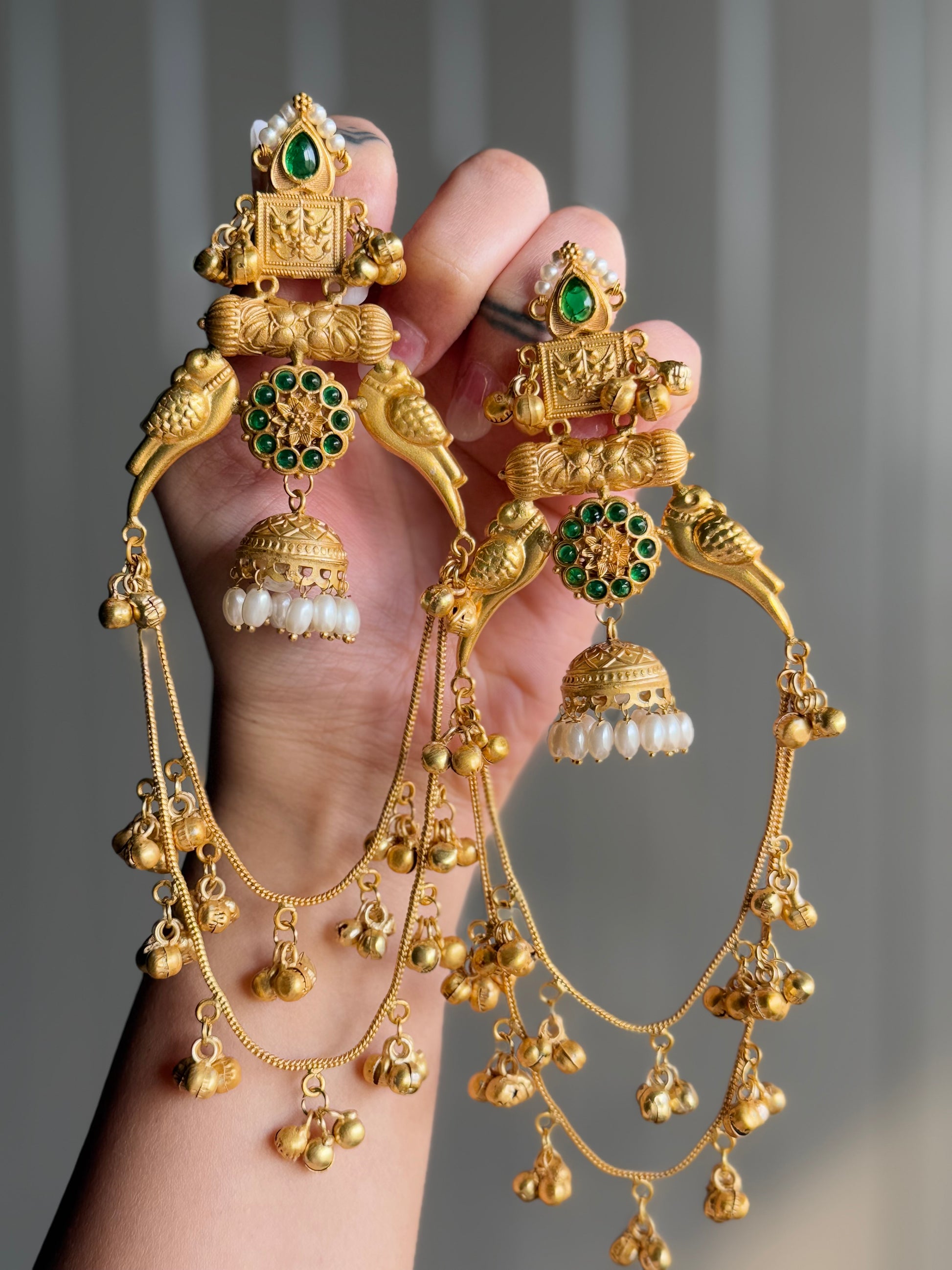 Introducing the Emeraldora Earrings, a majestic design crafted with timeless artistry and a royal touch. These earrings showcase intricate golden carvings with twin parrots, adorned with emerald-green stones and graceful pearl-studded jhumkas. The cascading chains with golden ghungroos add movement and charm, making them a perfect statement piece.