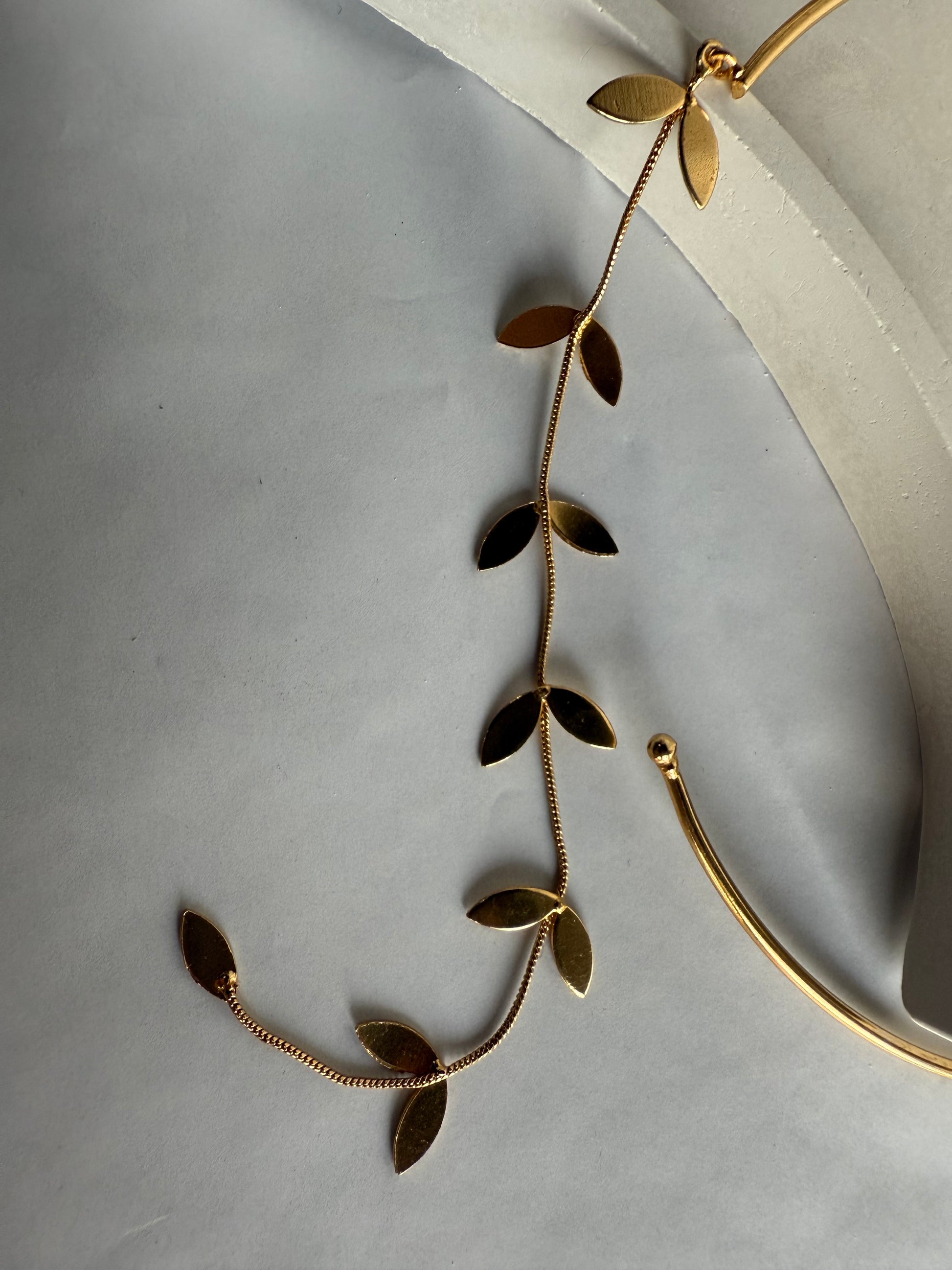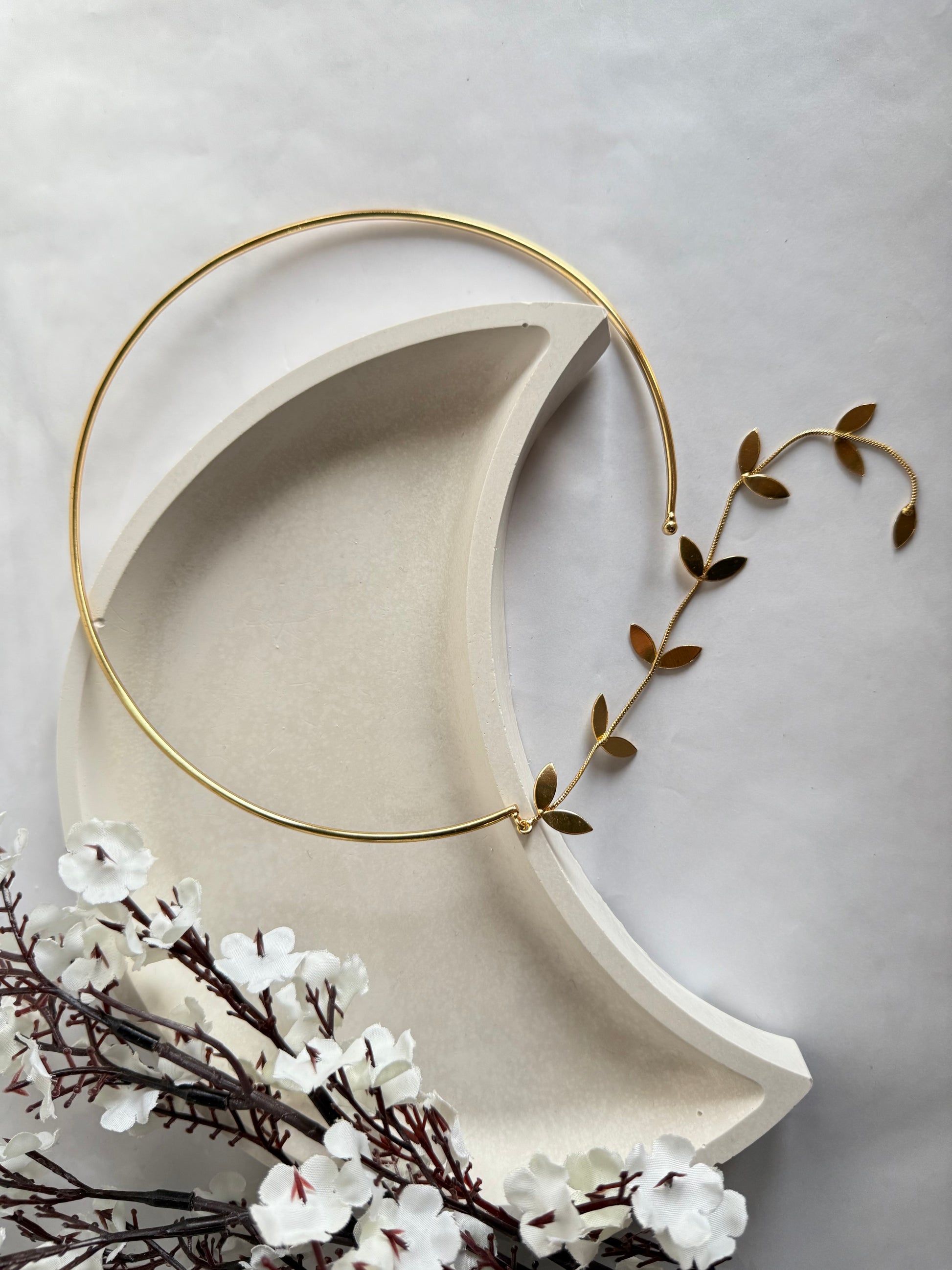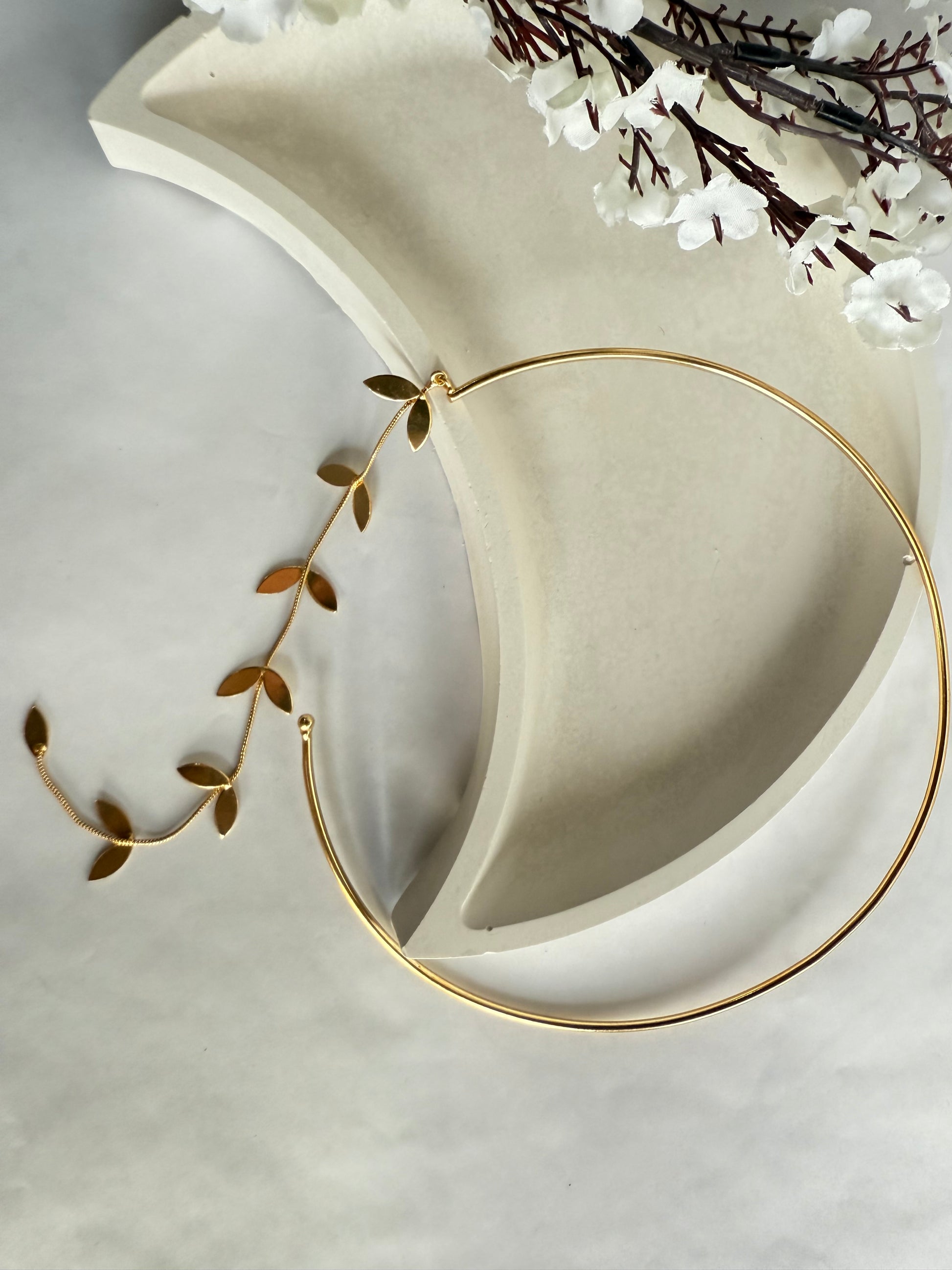 Graceful and nature-inspired, the Golden Leaf Hasli Necklace features a sleek golden band adorned with delicate cascading leaf motifs. This statement piece beautifully balances minimalism with artistic detailing, making it a versatile accessory for both festive and modern styling.