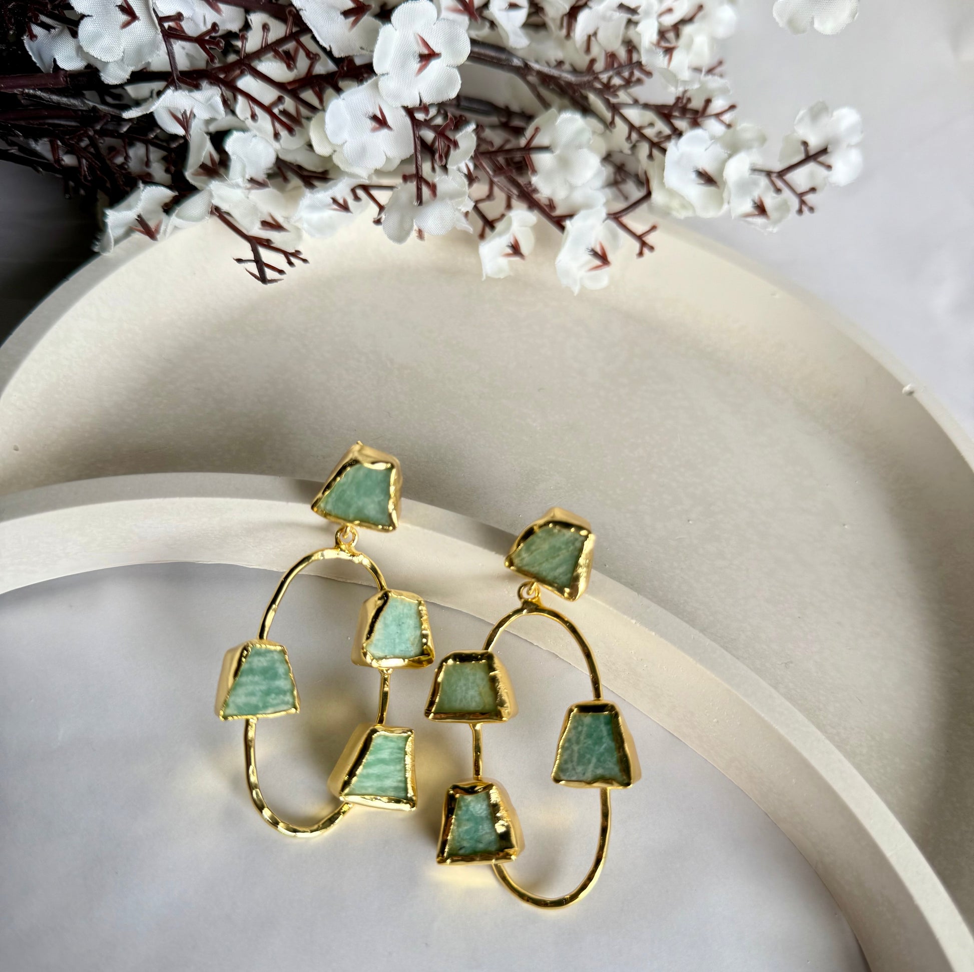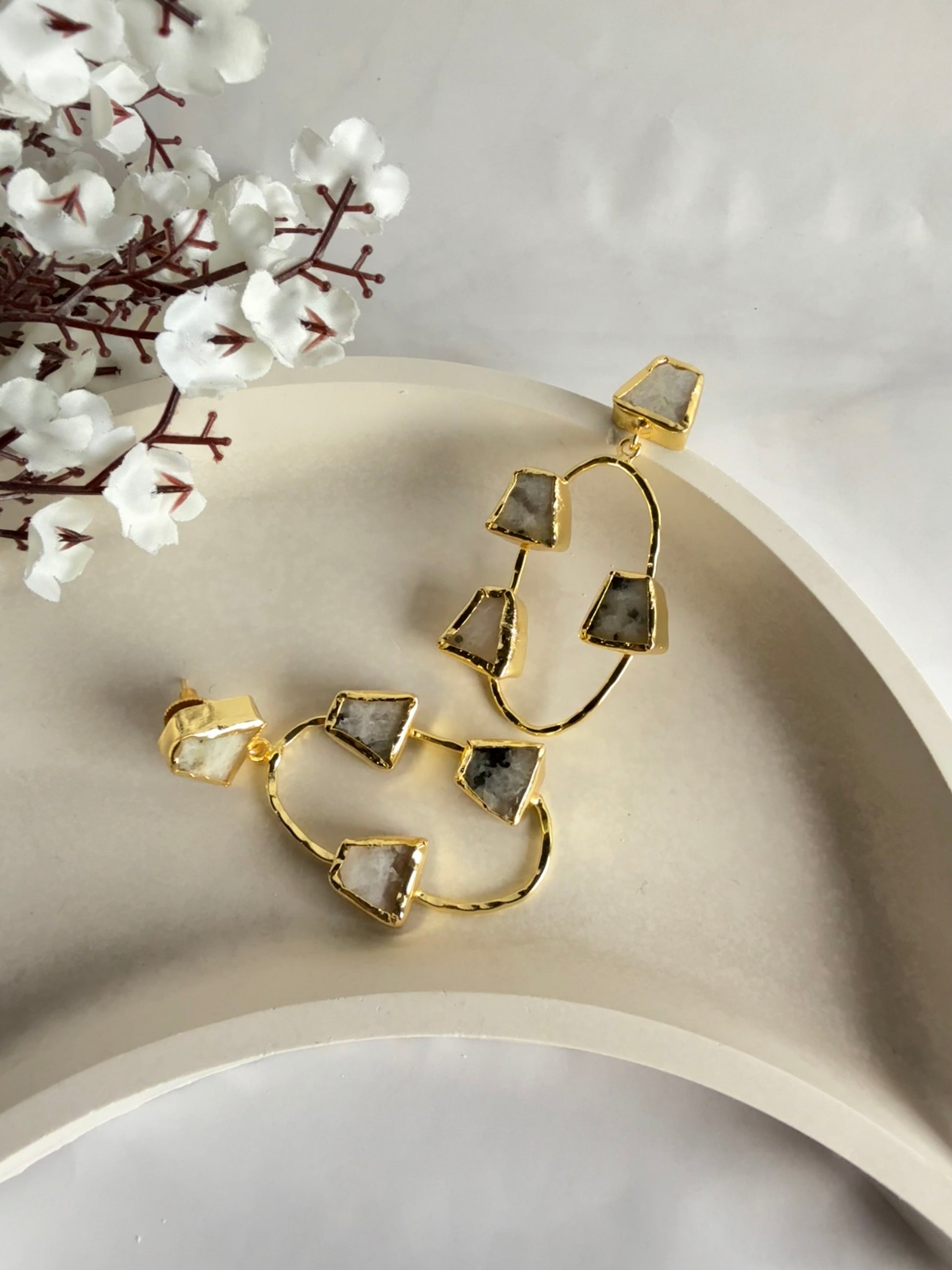 Elevate your look with these Golden Oval Frame Earrings, designed with raw white semi-precious stones set in a textured golden oval frame. The unique design blends contemporary elegance with artisanal craftsmanship, making them a standout addition to any jewellery collection.