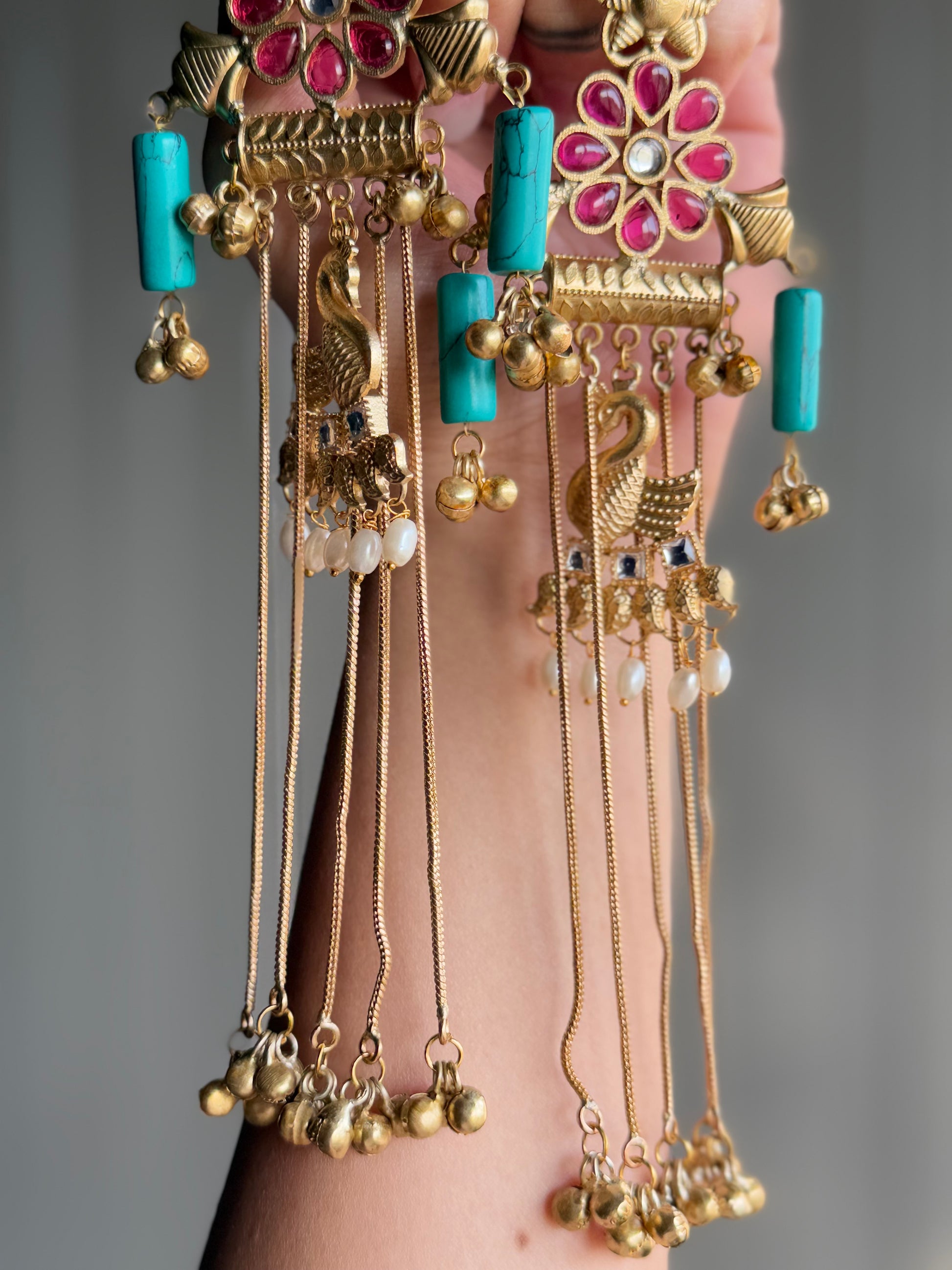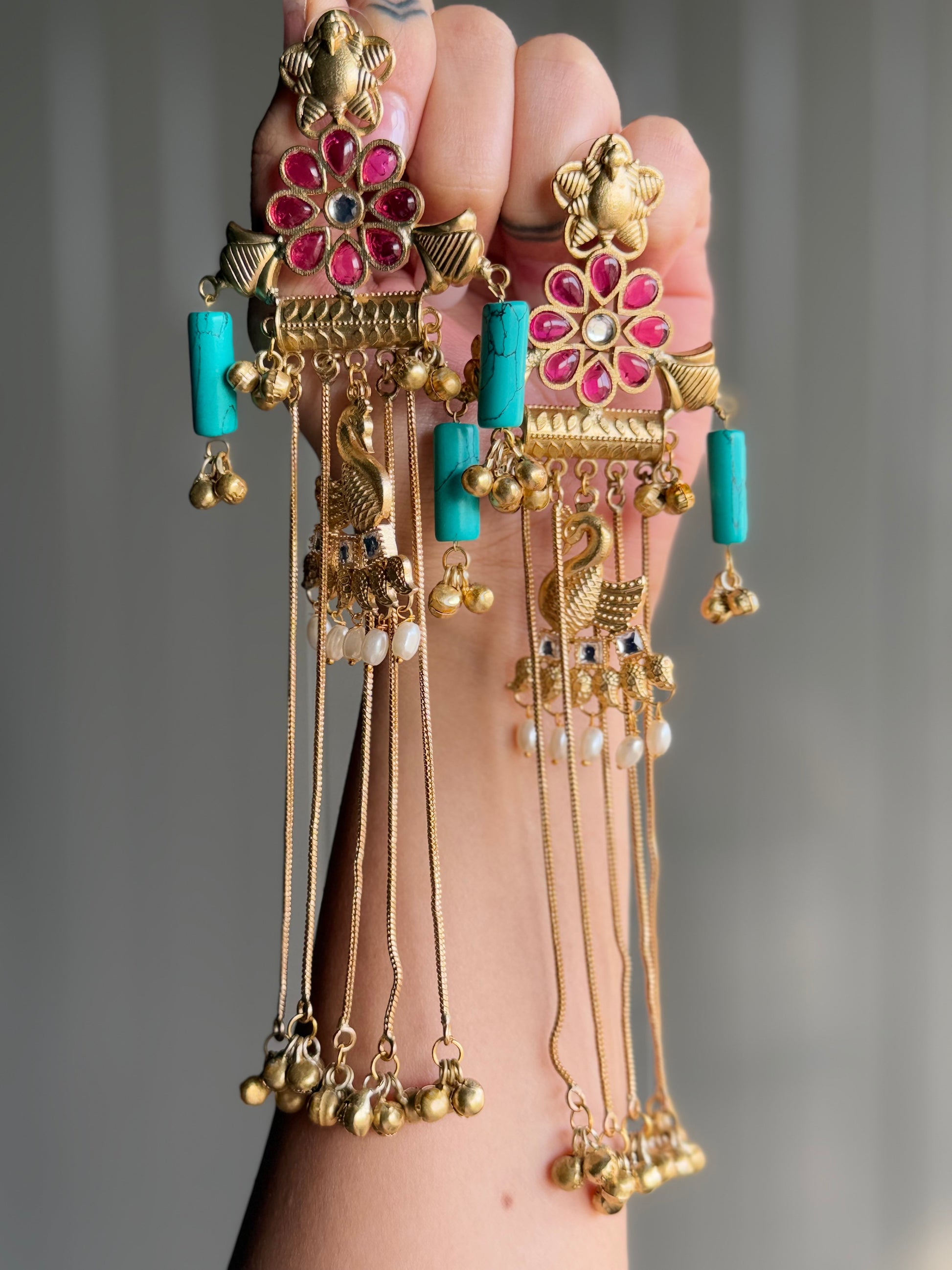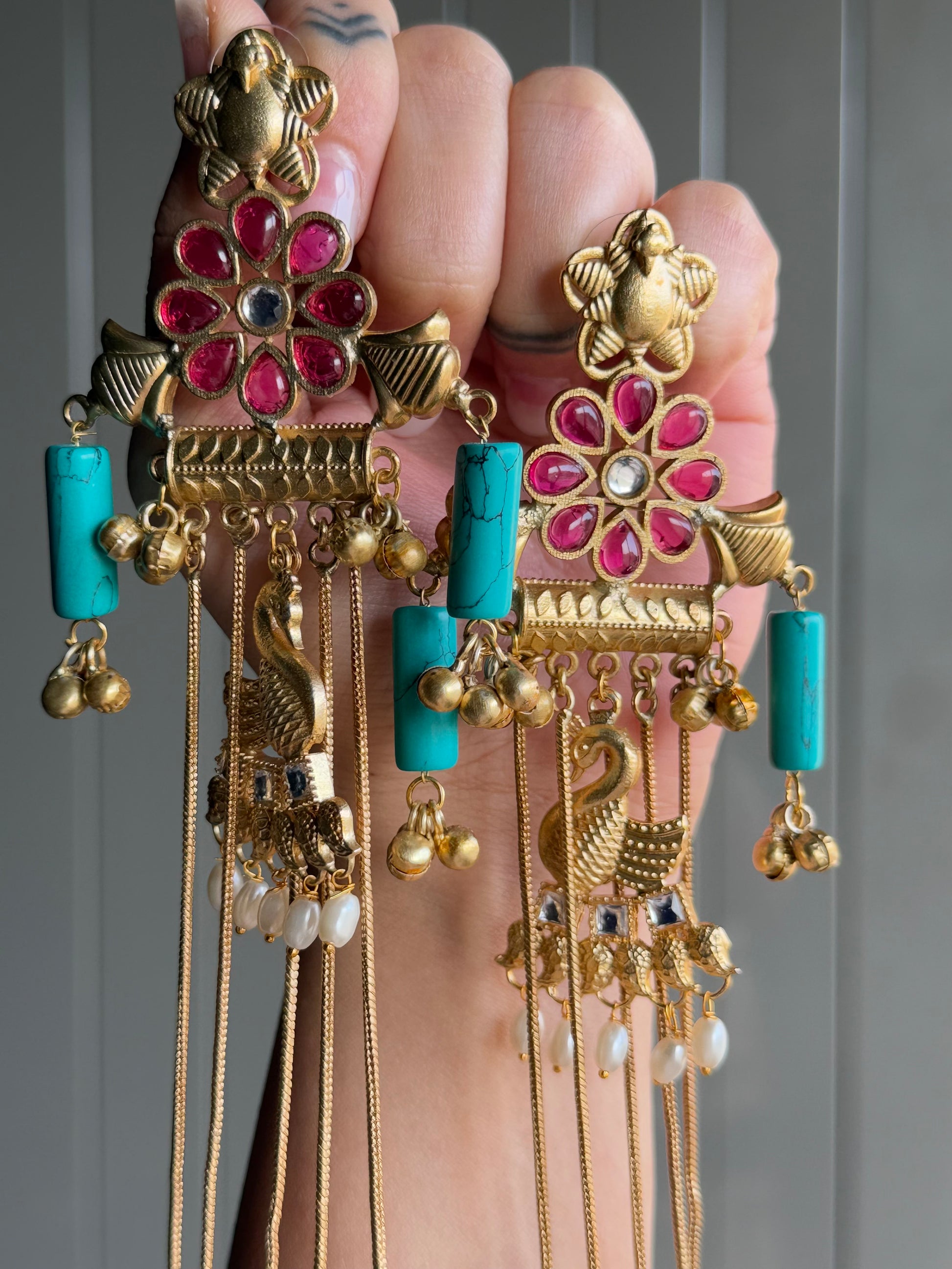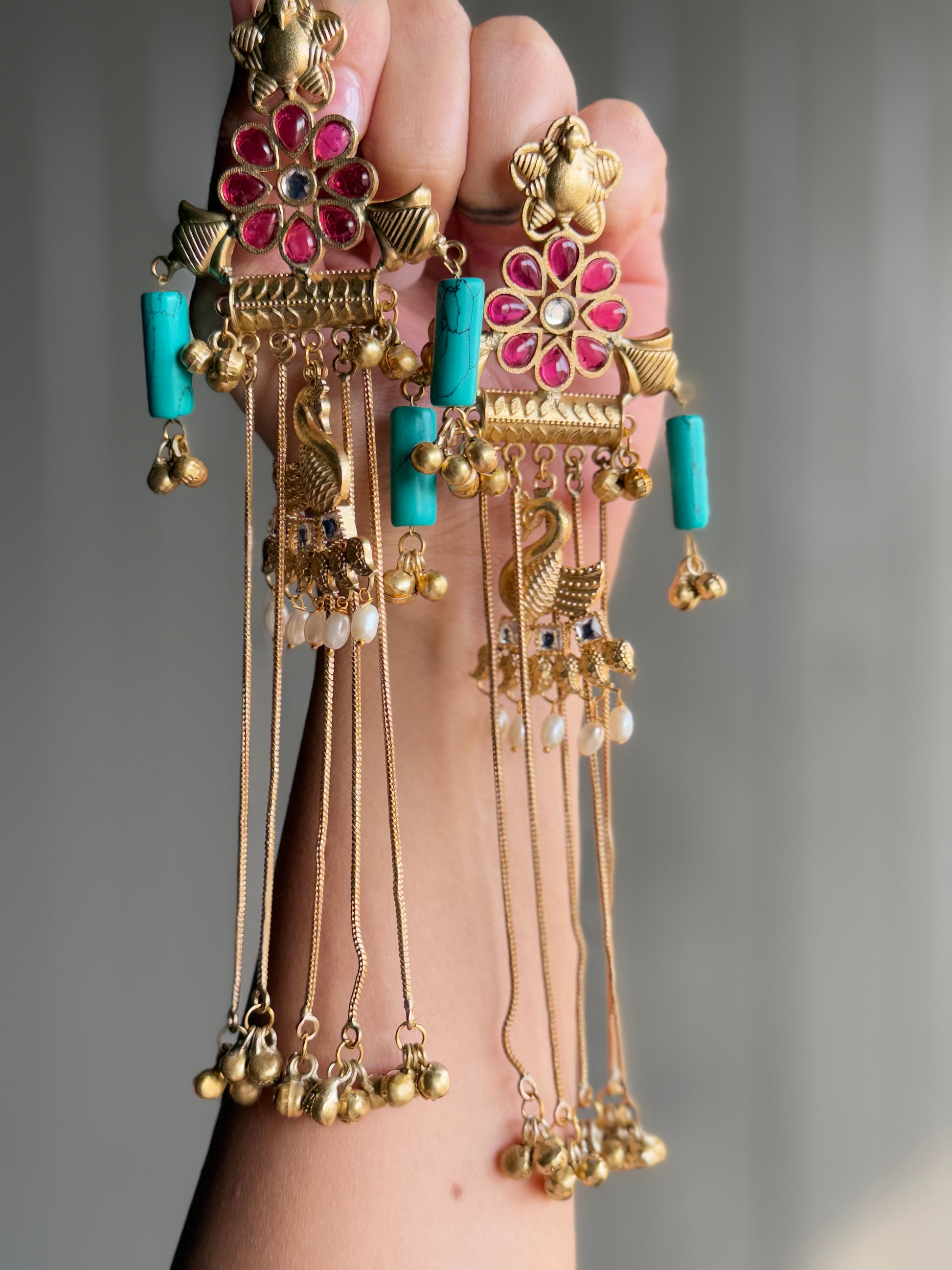 Celebrate the grandeur of Indian artistry with the Heritage Bloom Earrings, a radiant blend of color, craft, and heritage. The striking floral top, set with deep ruby-toned stones, flows into turquoise side accents that enhance the vibrancy of the design. The centerpiece showcases finely detailed peacock motifs, symbolizing grace and royalty, paired with cascading golden chains adorned with pearls and ghungroo drops for a rhythmic, elegant sway.