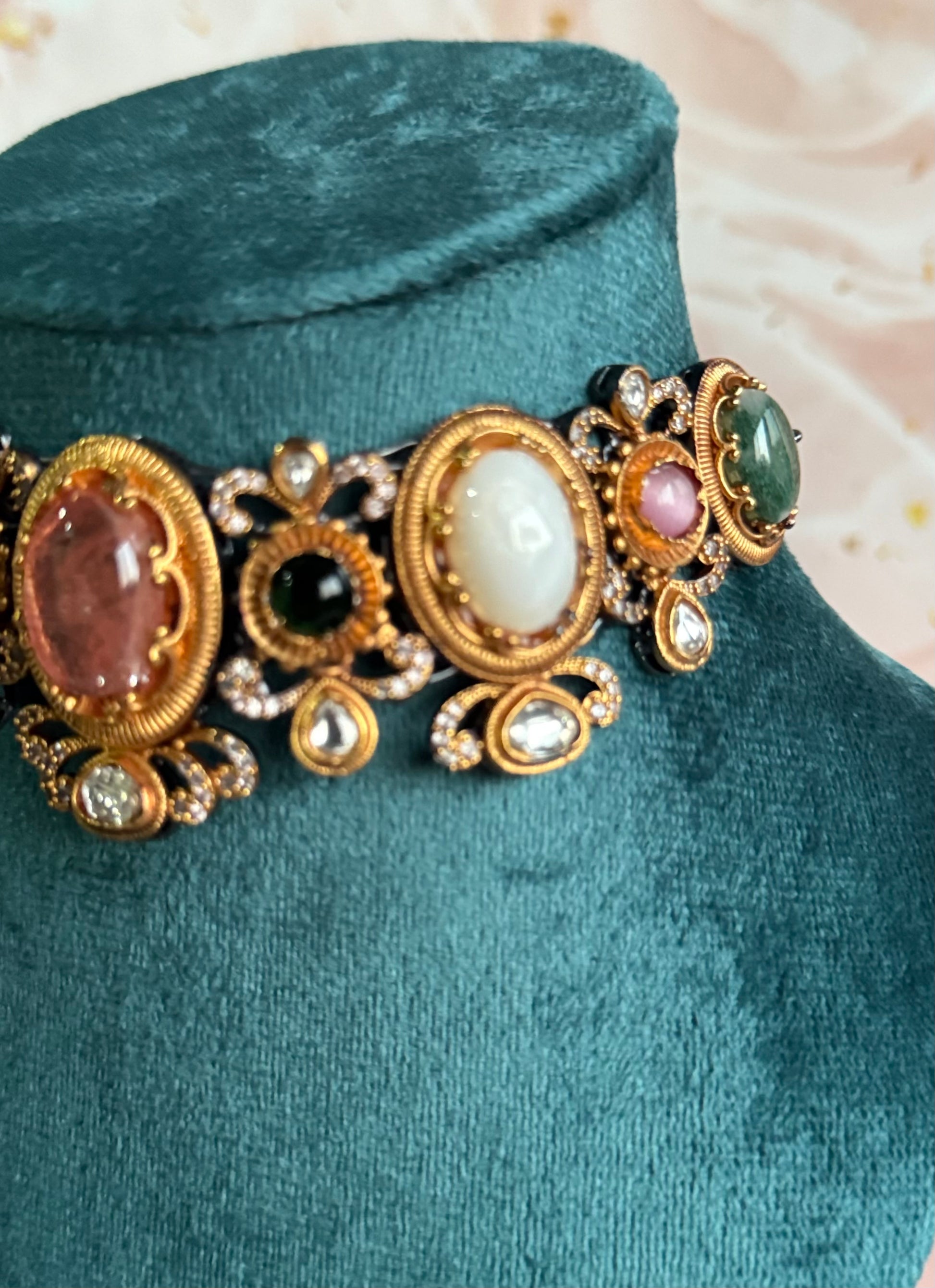 Step into timeless elegance with the Imperial Aura Neck Set, a regal creation that captures the essence of luxury and sophistication. Designed with intricately set oval stones in warm tones of peach, ivory, and emerald green, this choker is a perfect balance of grandeur and refinement. Paired with matching statement earrings, it creates a look that is both majestic and versatile, ideal for weddings, festive soirées, or royal-themed occasions.