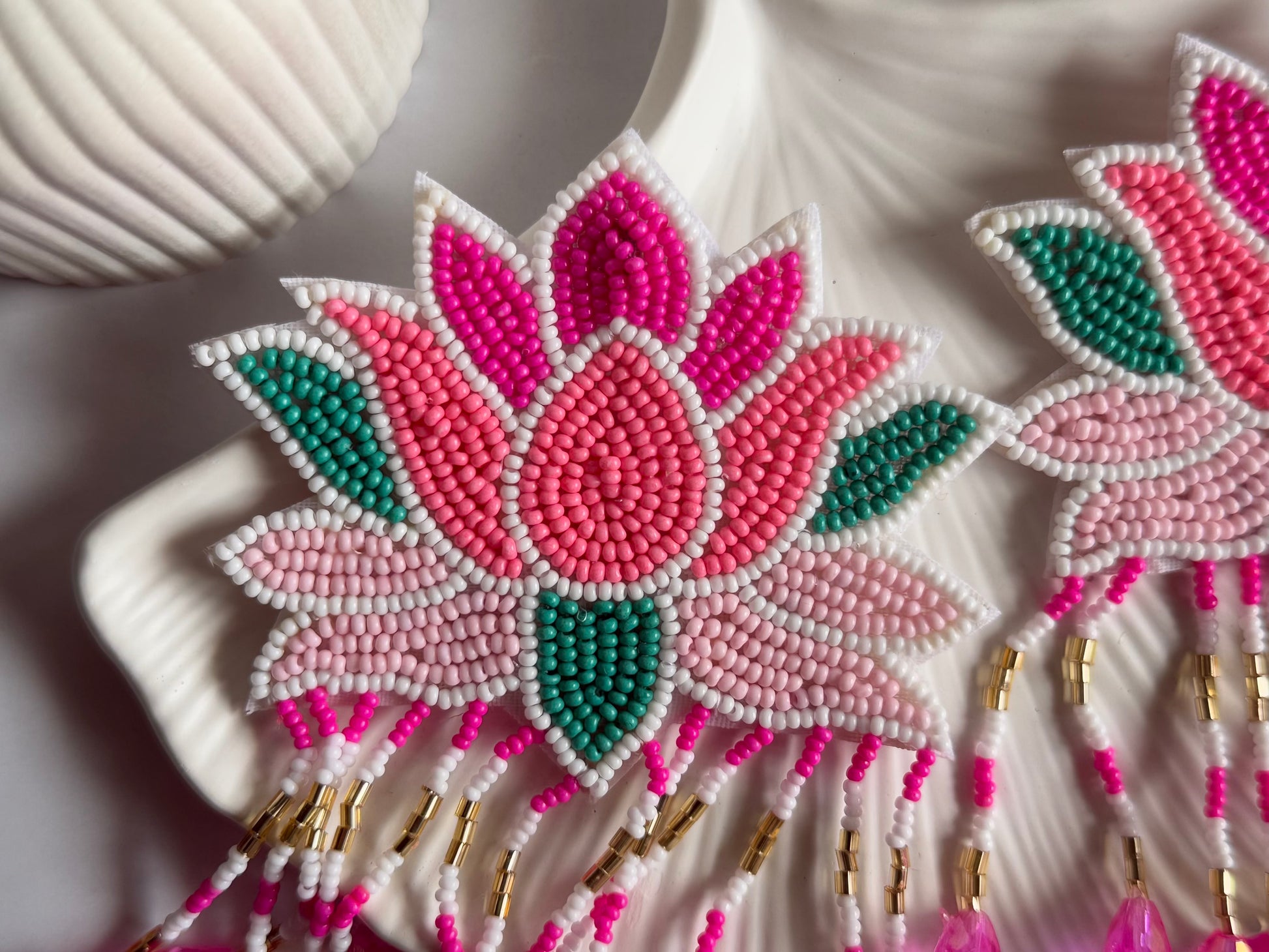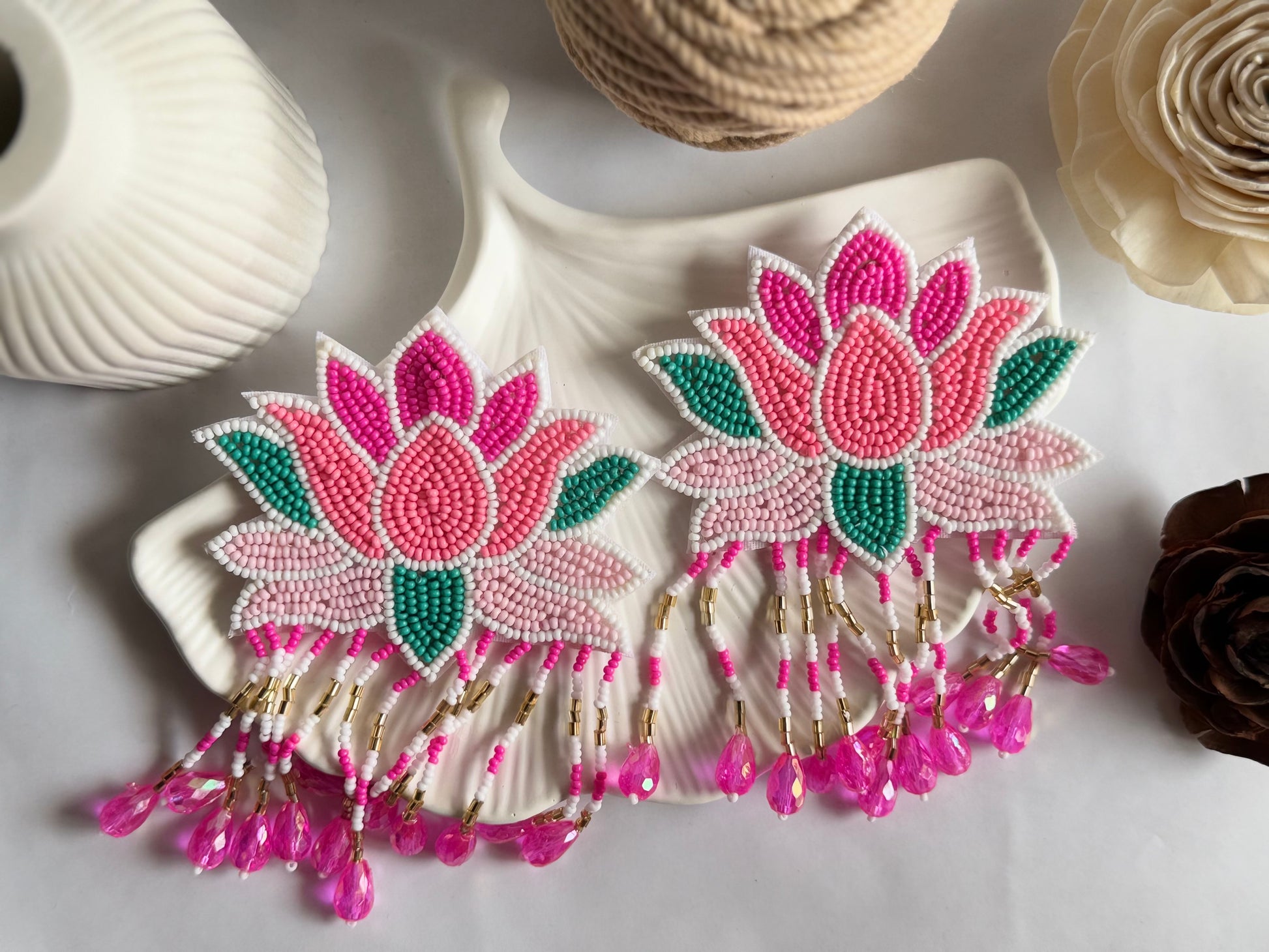 Introducing Lotus Earrings — bold, handcrafted lotus-inspired earrings designed to make every look bloom with elegance. With vibrant pink and green beadwork, these earrings radiate artistic charm while the dangling crystal drops add movement and sparkle. Perfect for weddings, festive occasions, or statement styling.