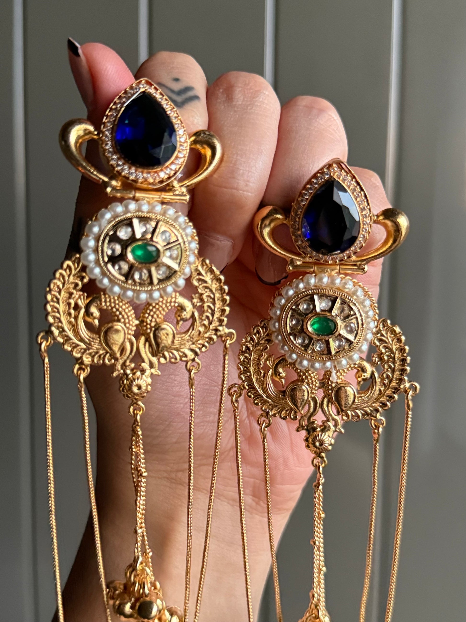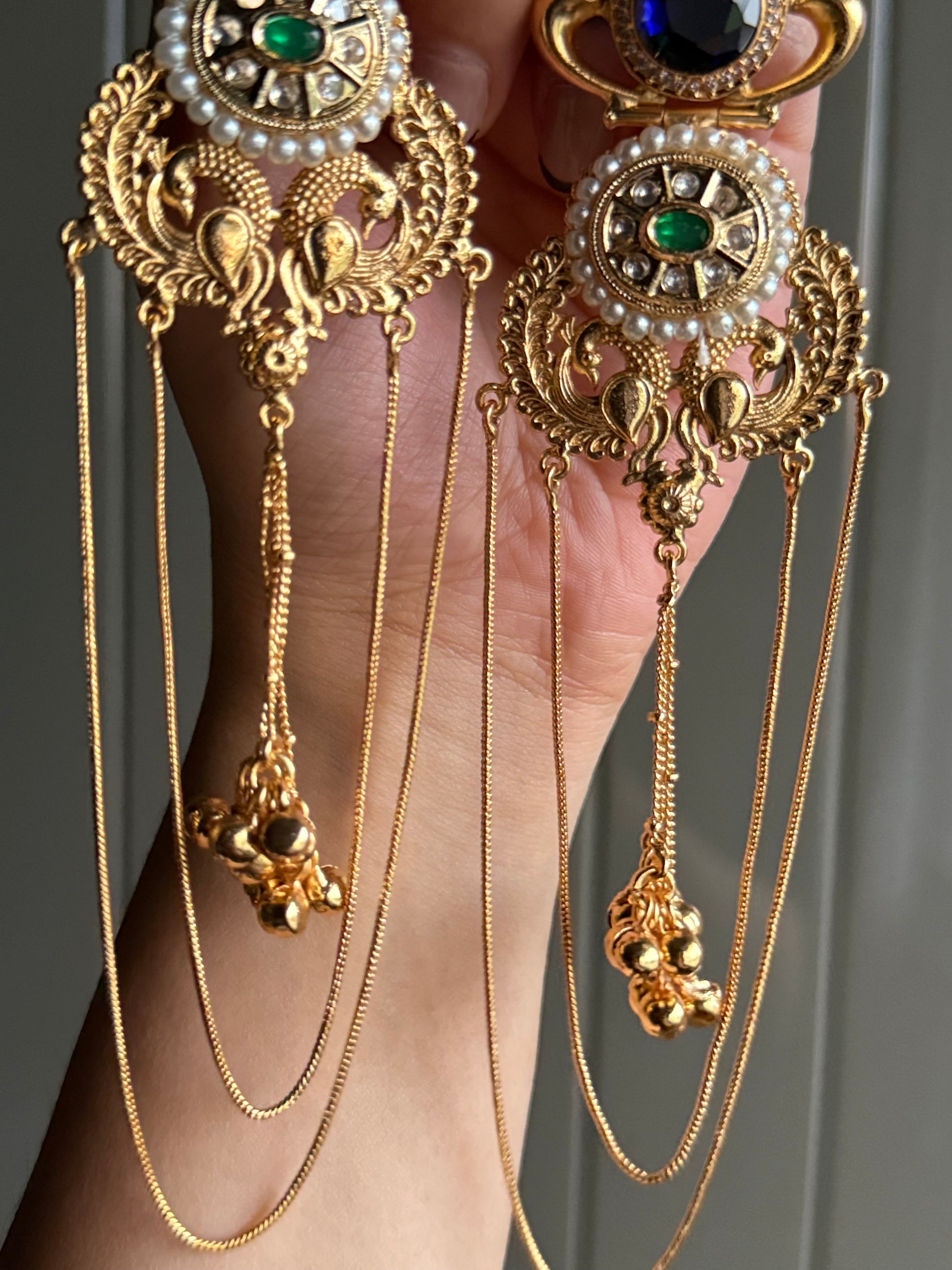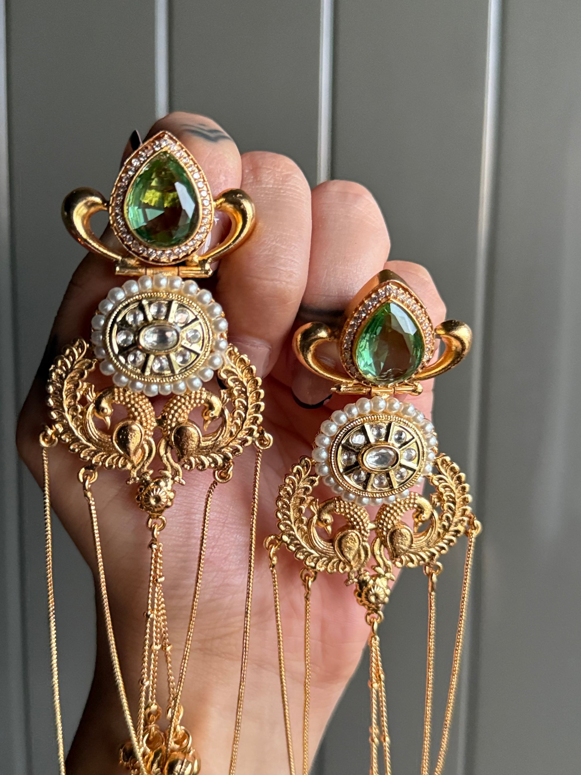 Step into timeless regality with the Lotus Glow Earrings. A striking green teardrop stone crowns the design, embraced by a lotus-inspired frame that signifies purity and prosperity. The central kundan cluster, bordered with delicate pearls, flows into intricate golden filigree work. Cascading golden chains with ghungroo drops complete the look, adding rhythm and grace to every movement.