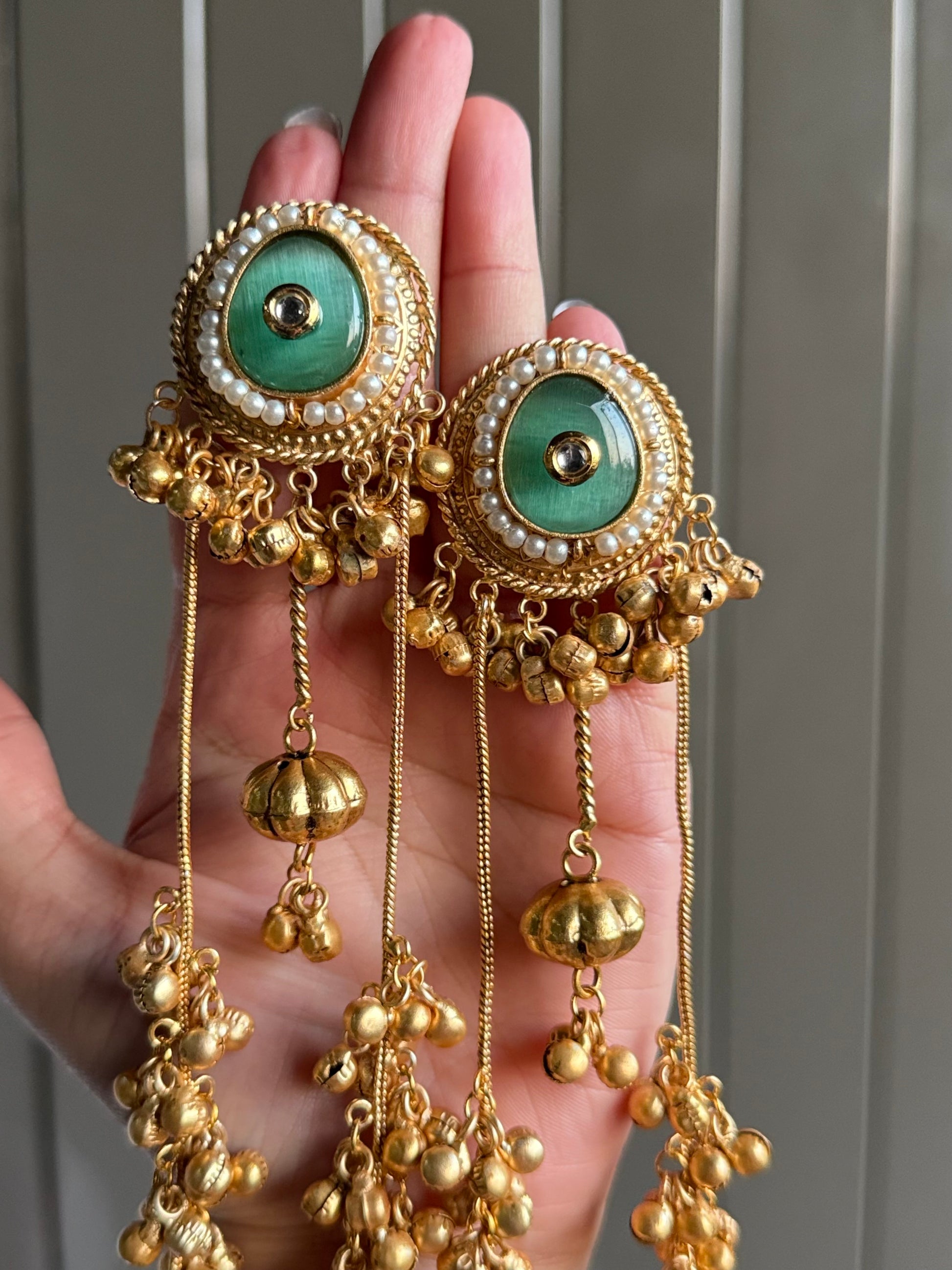 Step into timeless elegance with our Mystic Radiance Earrings, a statement pair crafted to captivate. Featuring a striking circular design highlighted with a green enamel center framed by delicate pearls, these earrings exude royal charm. The cascading golden ghungroo chains add fluid movement and a festive rhythm, making them the perfect blend of tradition and glamour.
