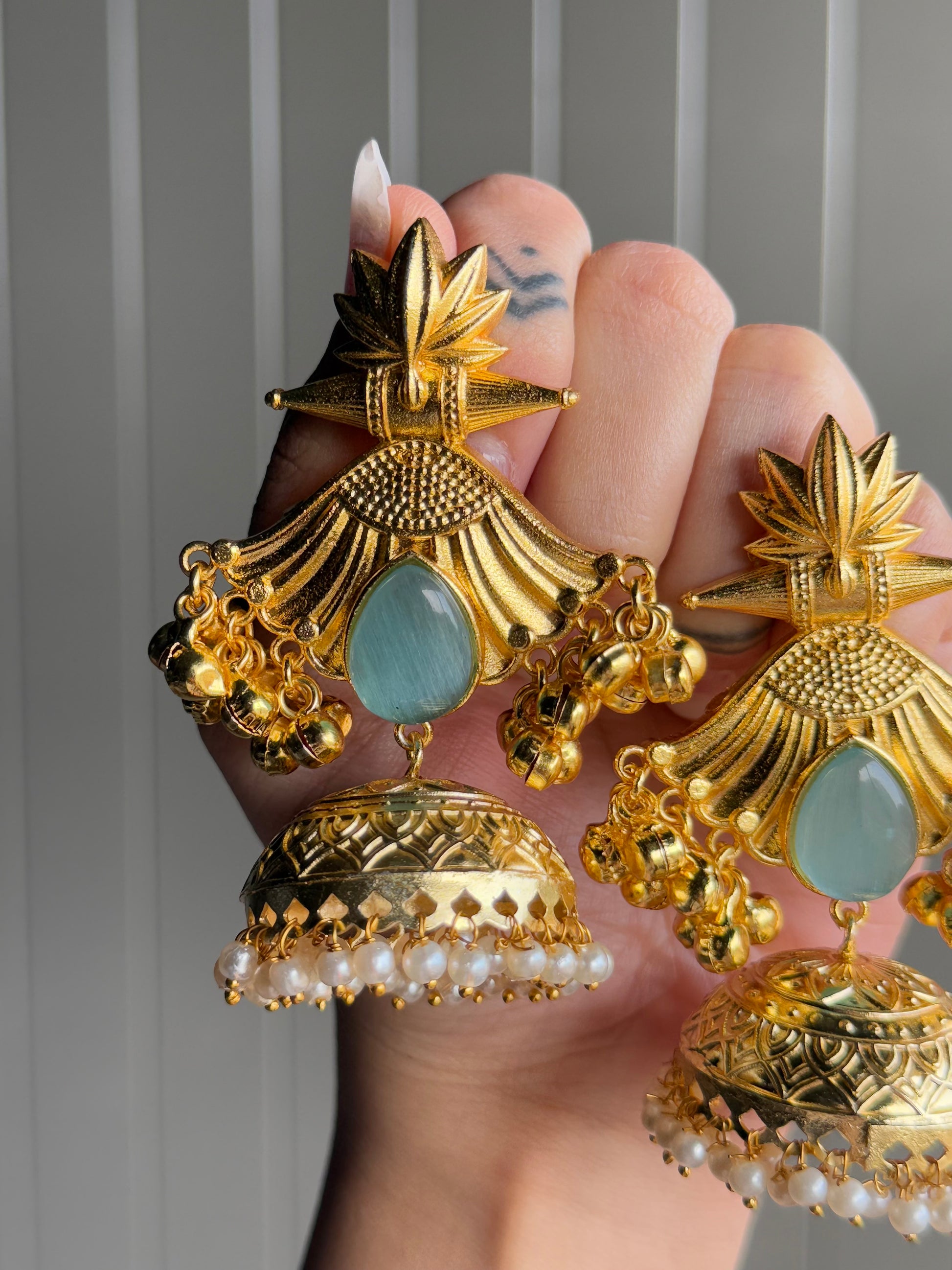 The Oraya Earrings embody majestic charm with their bold golden design, delicate pearl drops, and soothing aqua stone centerpiece. Perfectly balancing grandeur with elegance, these earrings are crafted to stand out in every festive or traditional look.