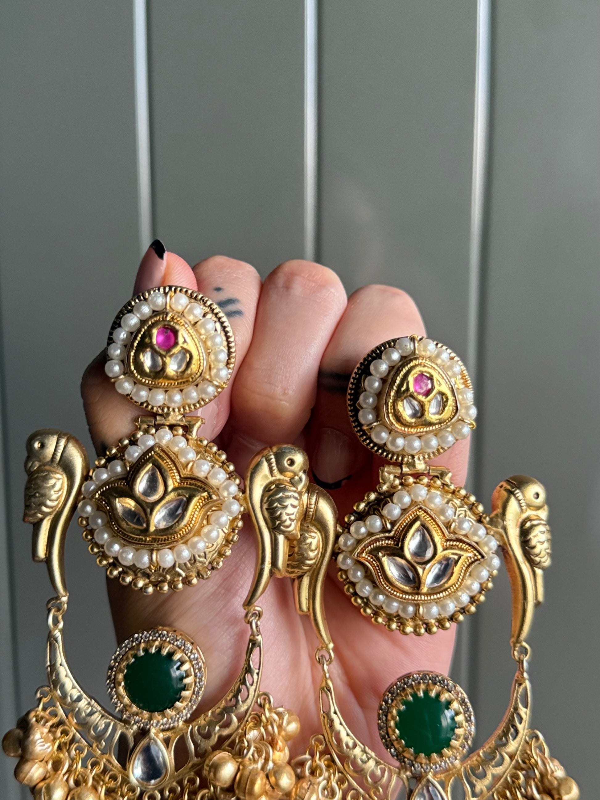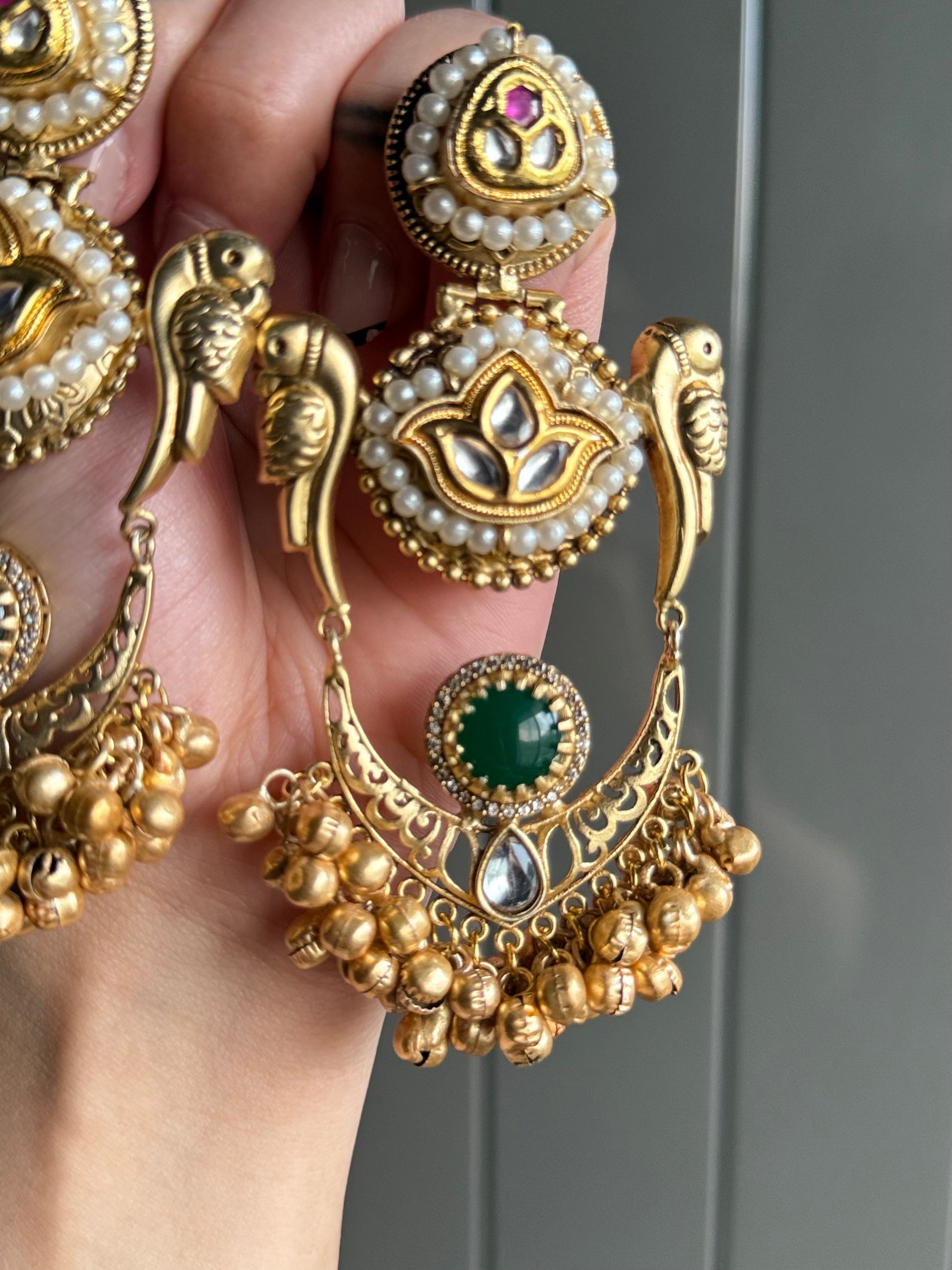 Adorn yourself with the heritage elegance of the Rajwada Parrot Charm Earrings. These statement pieces feature intricate parrot motifs perched gracefully on either side, symbolizing love and prosperity. The design blends kundan embellishments, pearls, and deep green accents with cascading golden ghungroo charms for a majestic finish. A true reflection of royal artistry, these earrings are perfect for weddings, festive occasions, and cultural celebrations.