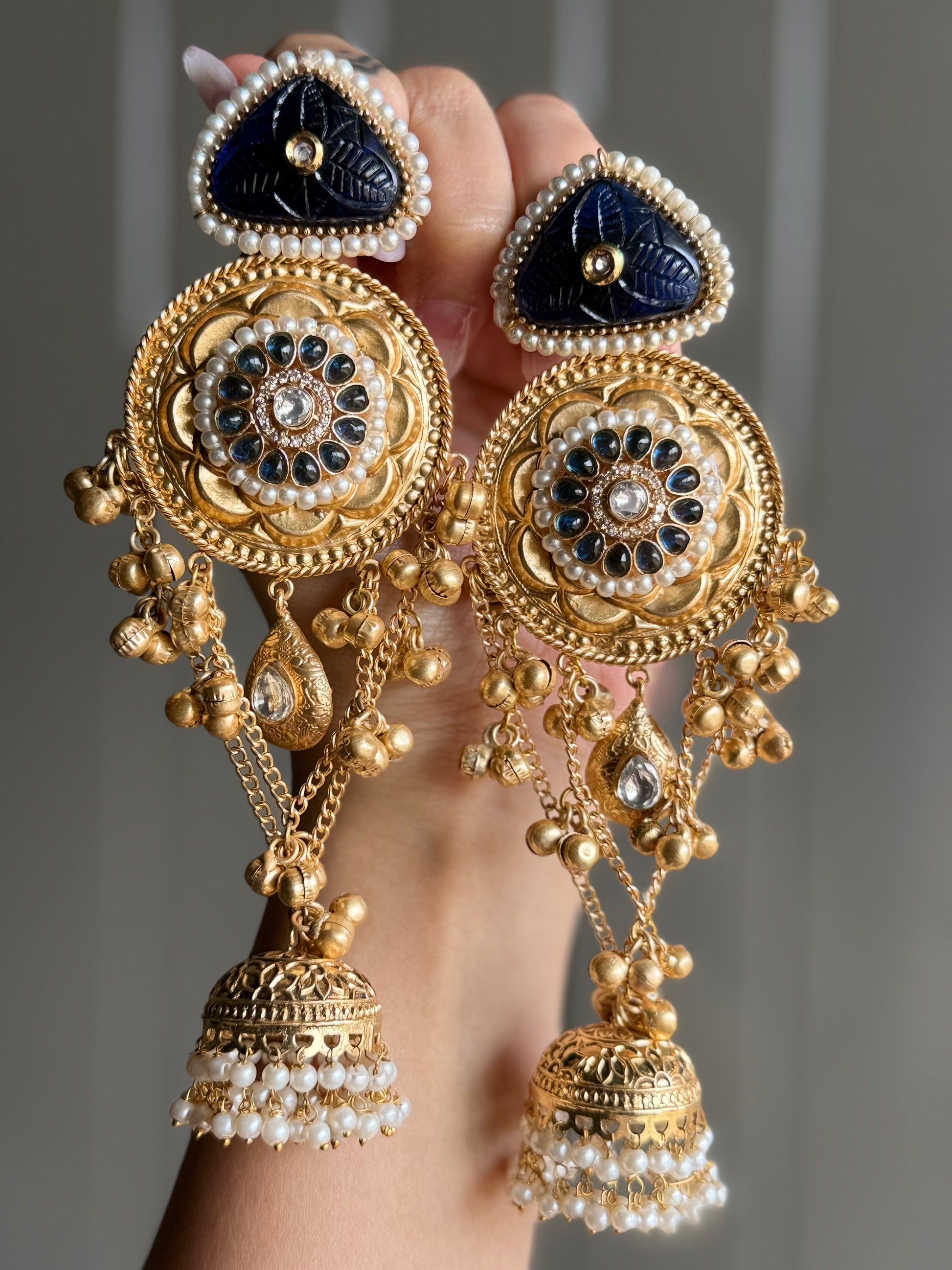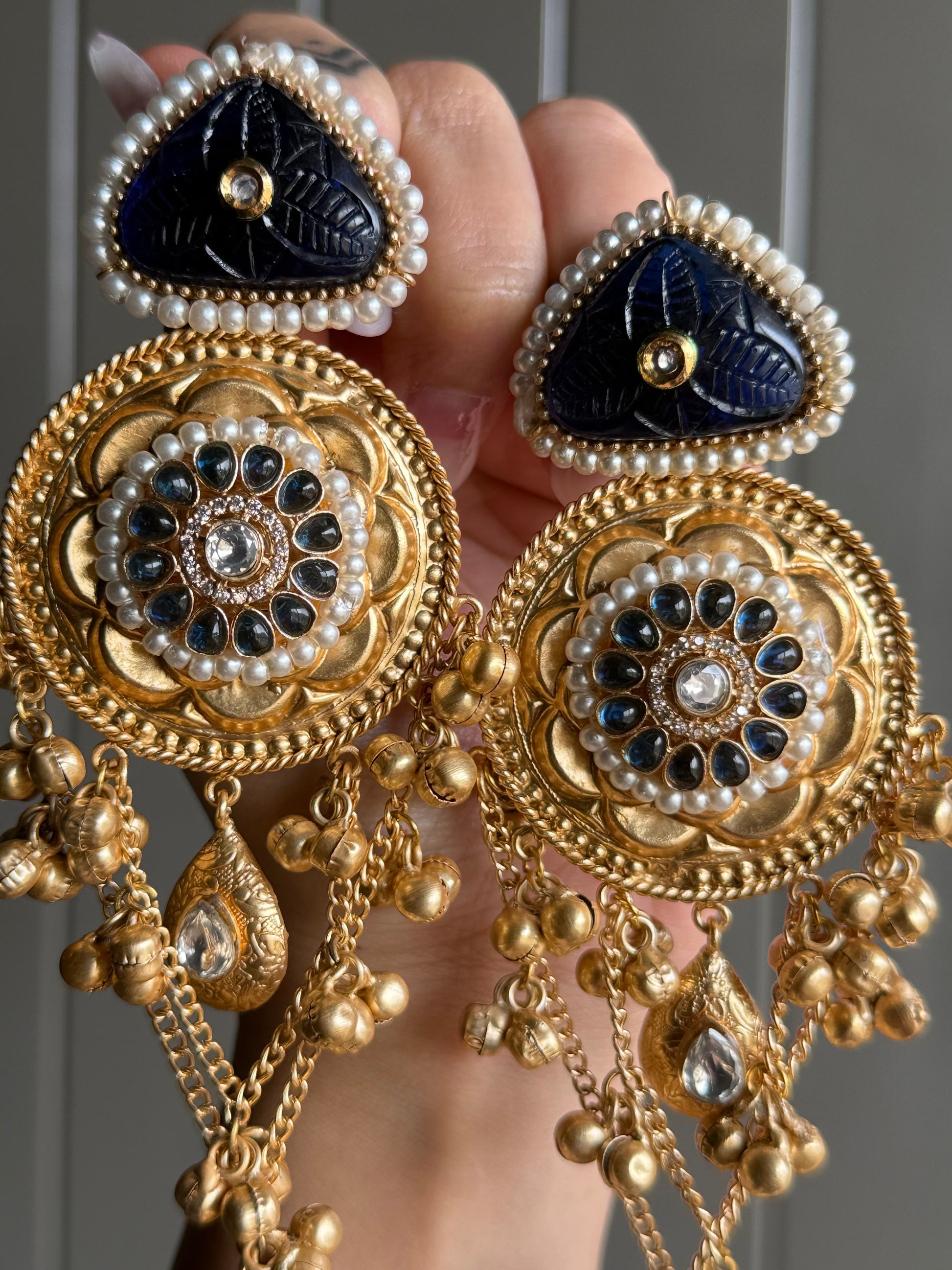 Embody the essence of royal grandeur with Rajwada Shringar Earrings, a masterpiece inspired by regal traditions and timeless artistry. Featuring a bold navy triangular stud bordered with delicate pearls, the design cascades into intricate circular motifs adorned with kundan-style stones, golden ghungroo clusters, and traditional jhumka drops lined with white pearls.