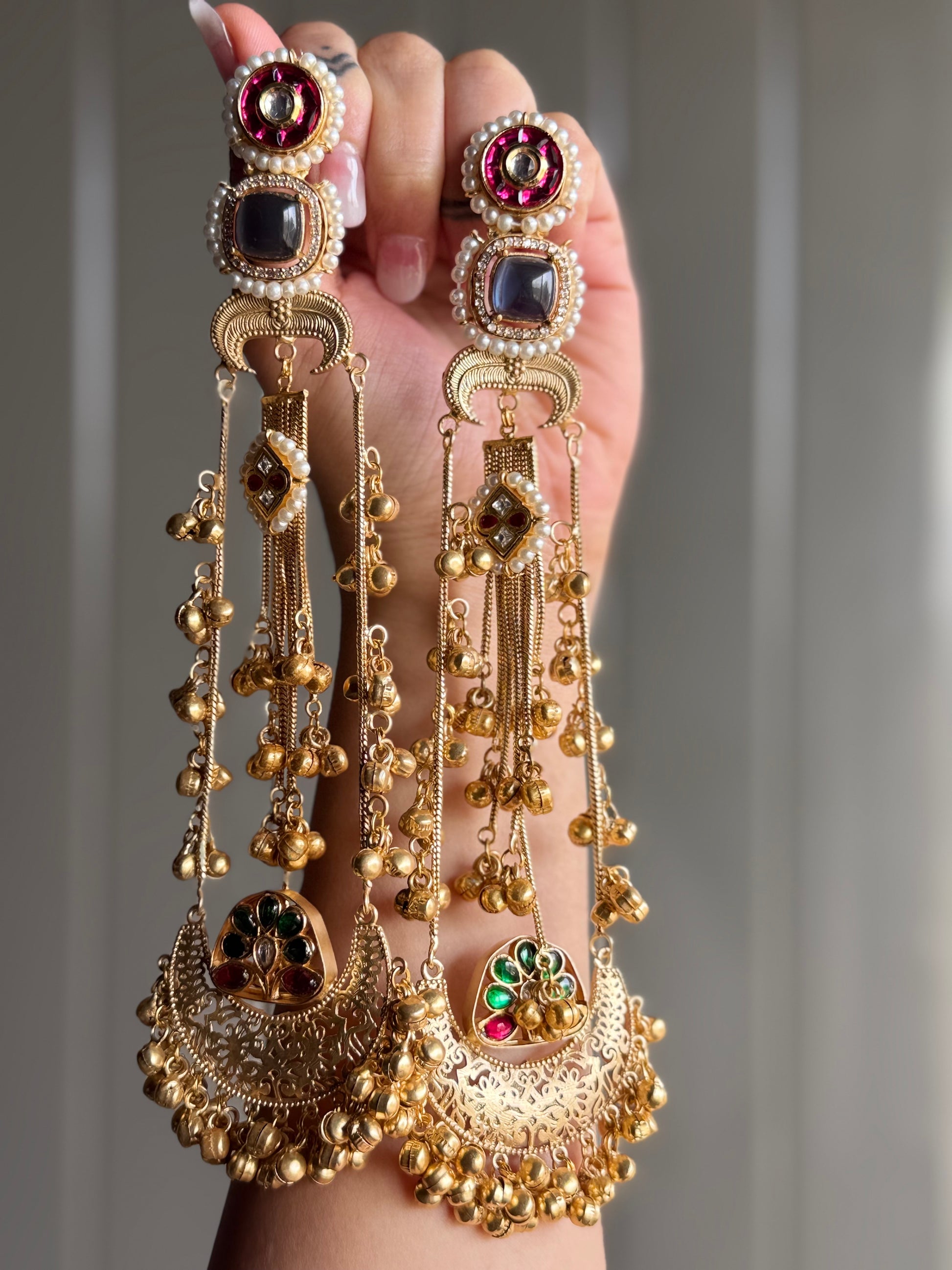 The Ratna Kalash Earrings are a regal celebration of craftsmanship, adorned with layered kundan studs framed in pearls, leading to cascading golden chains and delicate ghungroo accents. The intricately carved crescent-shaped base, studded with multicolored gemstones, evokes the grandeur of royal kalash motifs, symbolizing prosperity and festivity.