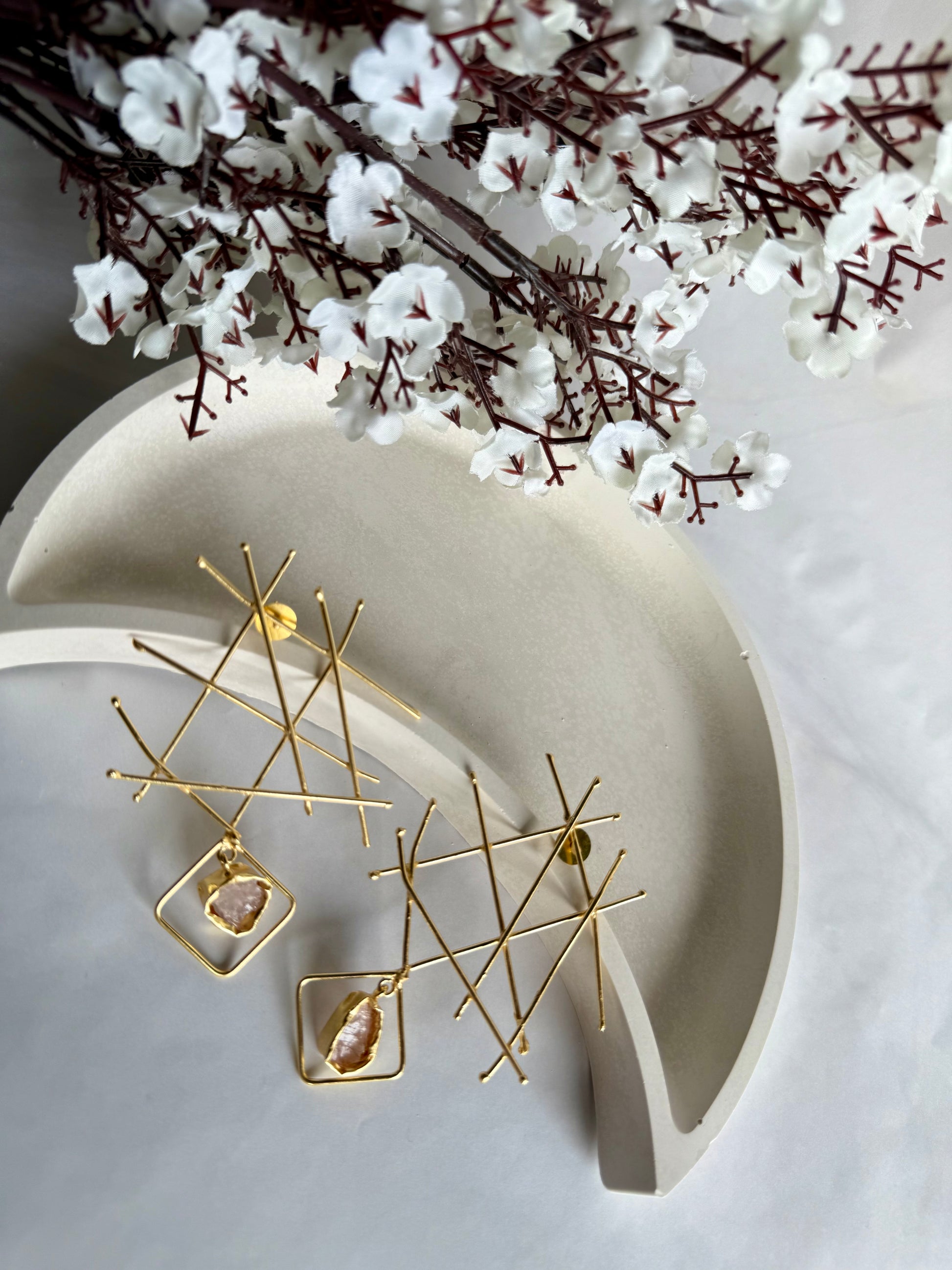 Modern and artistic, the Starlight Grid Earrings feature a bold crisscross golden frame paired with a raw semi-precious stone set inside a geometric drop. These earrings strike the perfect balance between edgy and elegant, making them a standout accessory for those who love statement jewellery.