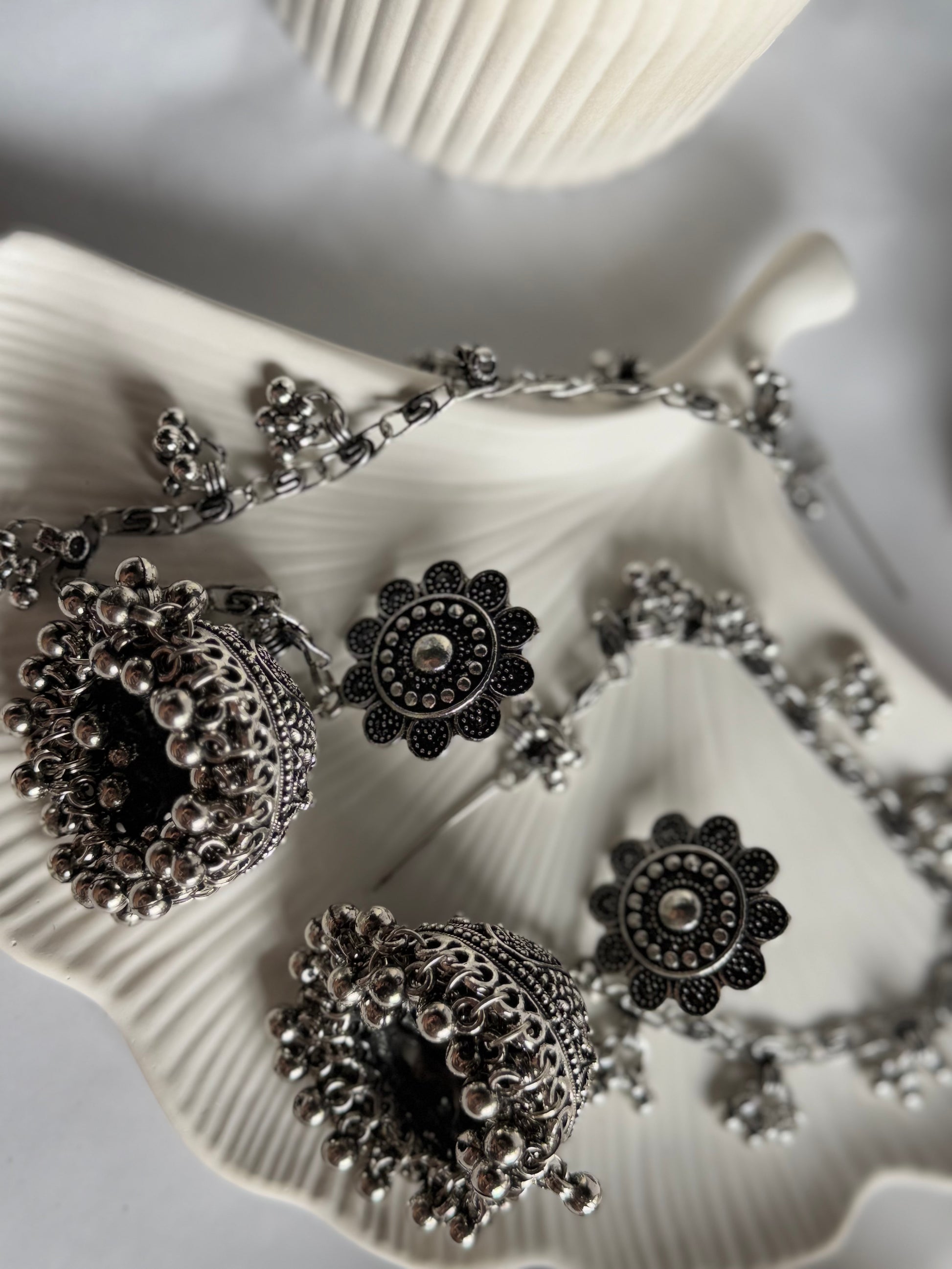 Presenting Taruni Earring, a striking pair of oxidized silver earrings with an attached hair chain, blending traditional charm with effortless grace. The earrings feature bold jhumka domes with intricate ghungroo layers, paired with a delicate floral stud design and finished with a hair chain that adds royal elegance.