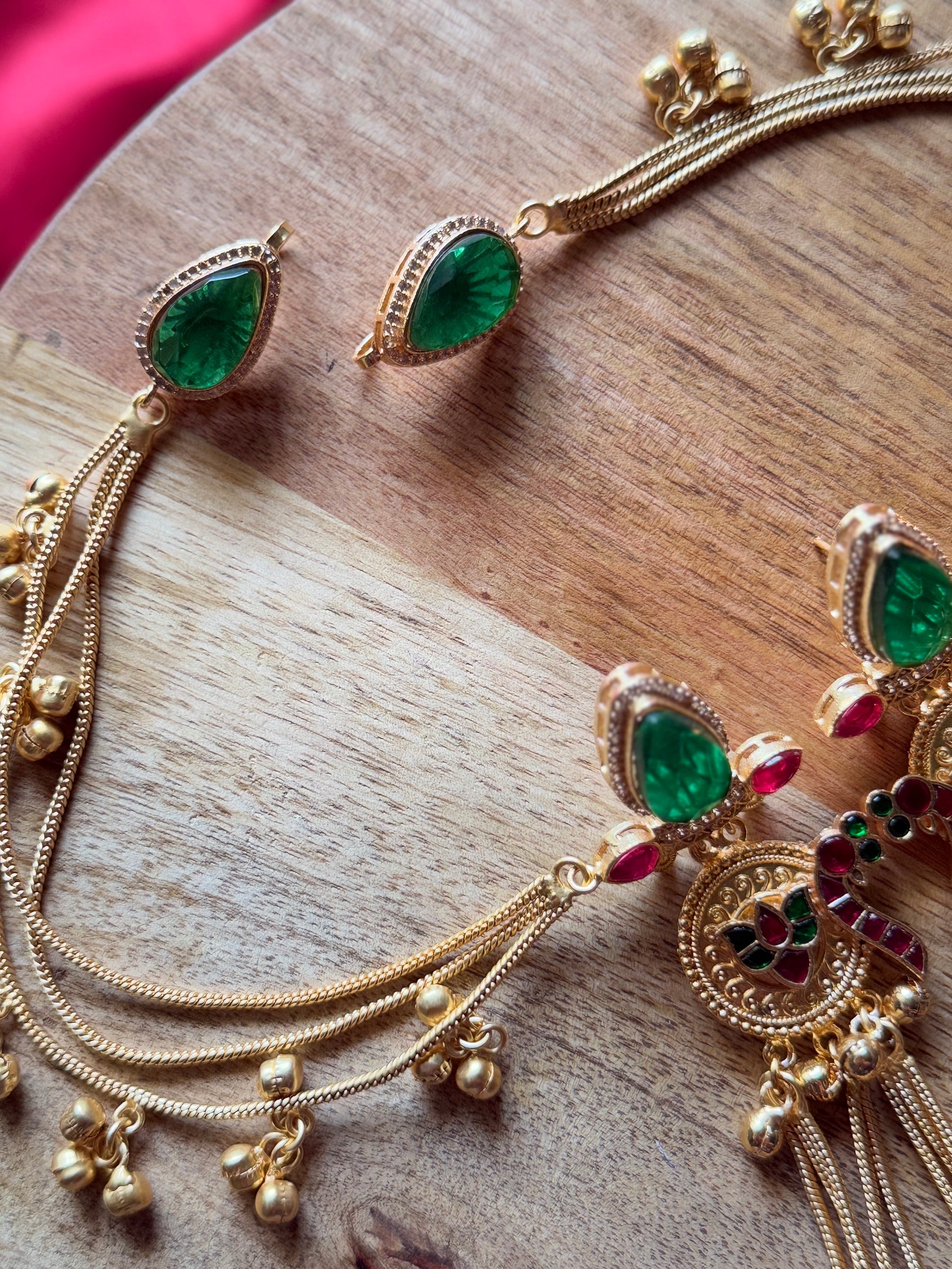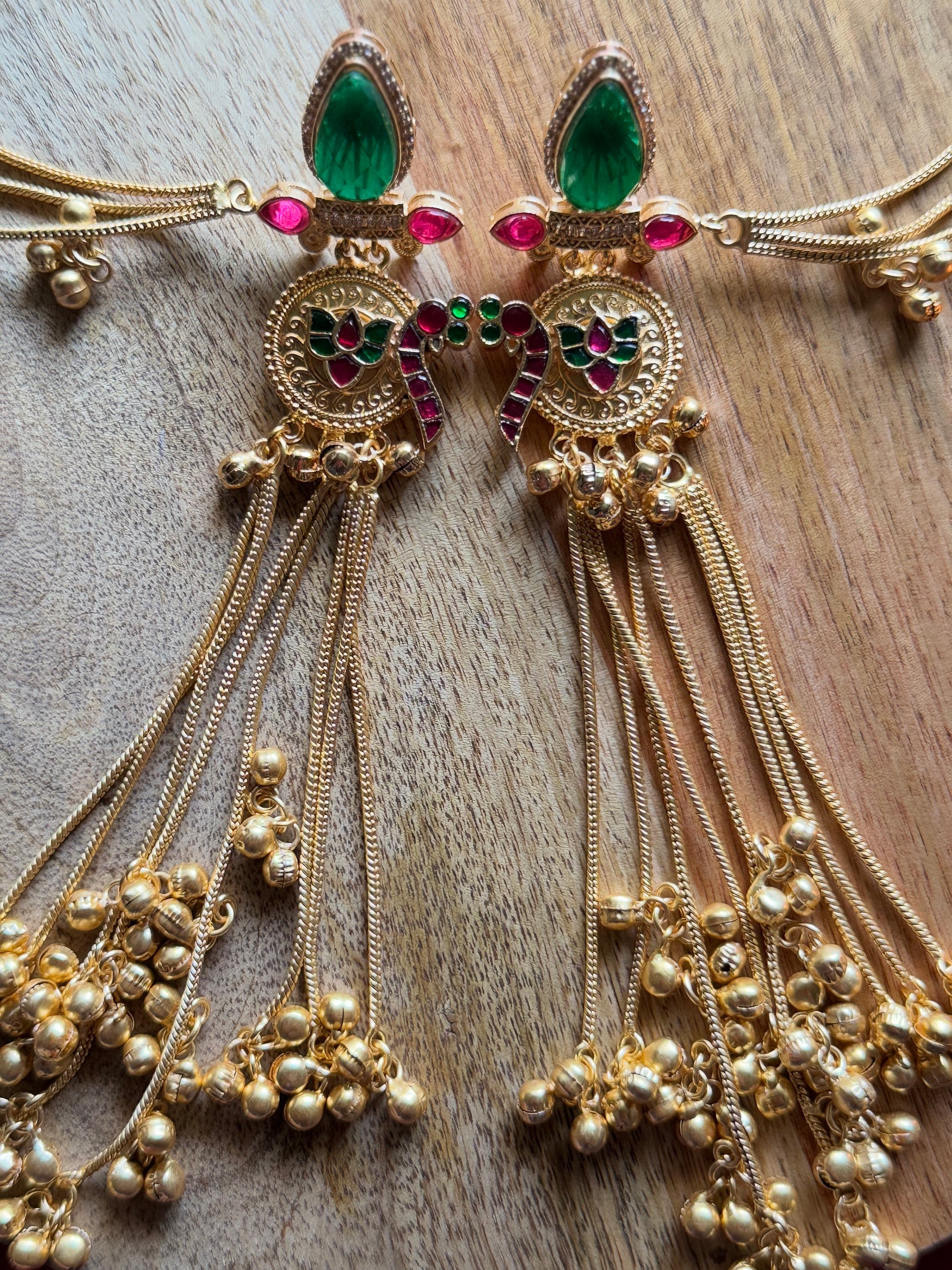 Step into timeless elegance with these enchanting heritage earcuffs. Adorned with peacock-inspired motifs, lush green stones, and delicate red enamel detailing, this pair beautifully merges tradition with modern charm. The cascading golden chains with ghungroo drops add a regal rhythm to every movement.