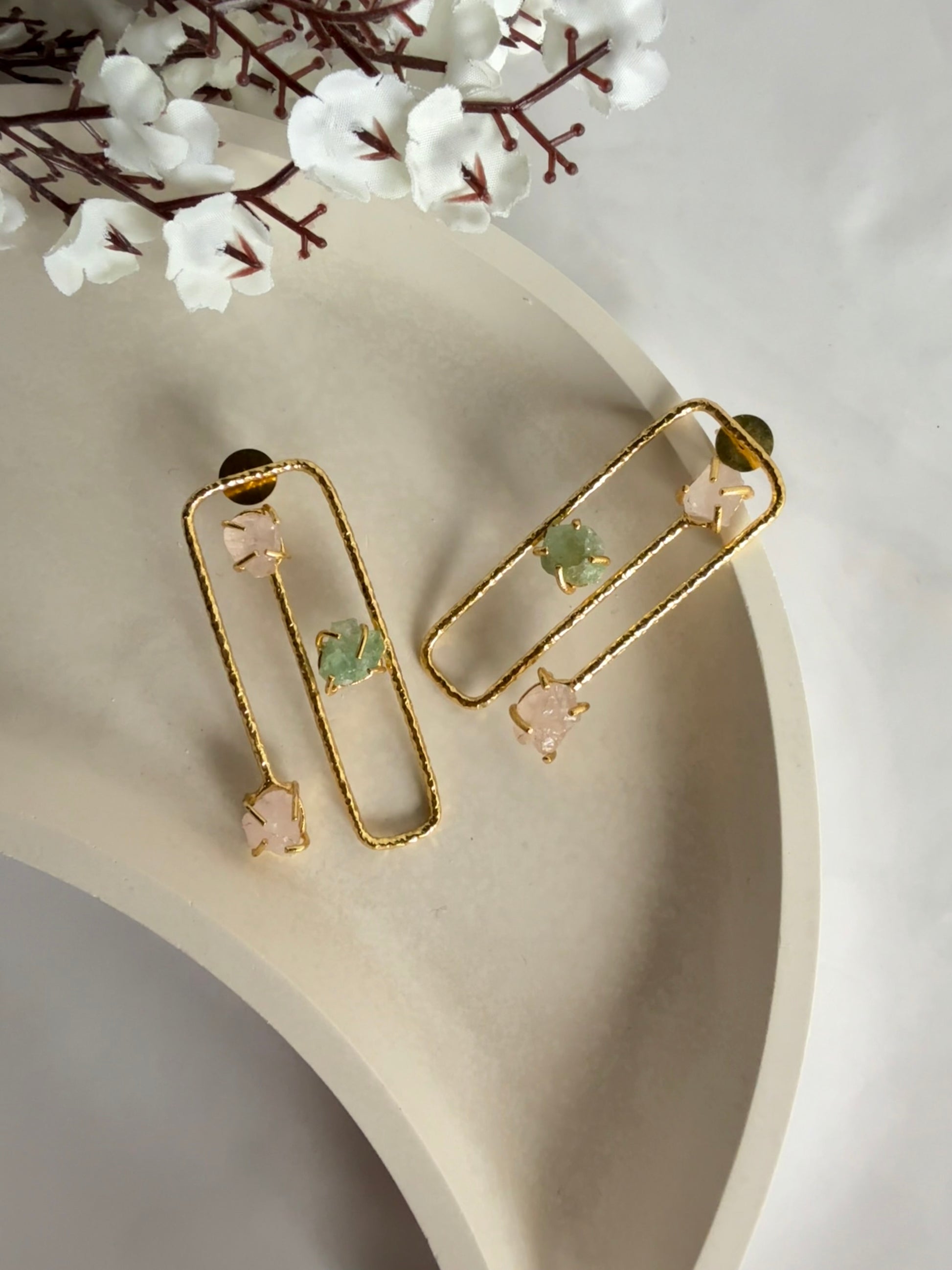 The Golden Twilight Gem Earrings feature a hammered rectangular golden frame adorned with raw amethyst and green stones. Their handcrafted texture and raw crystal accents bring an organic yet bold statement to your style.