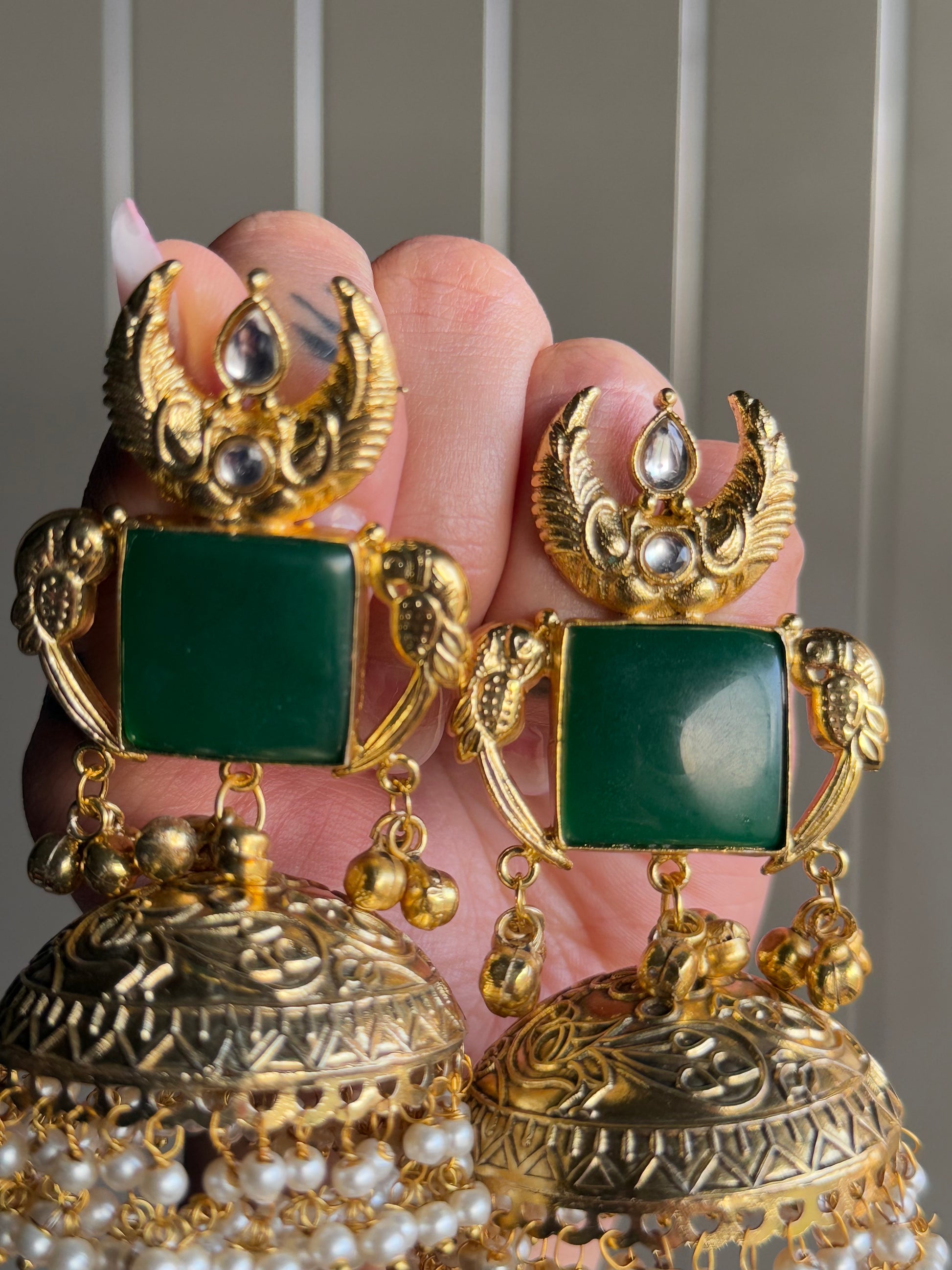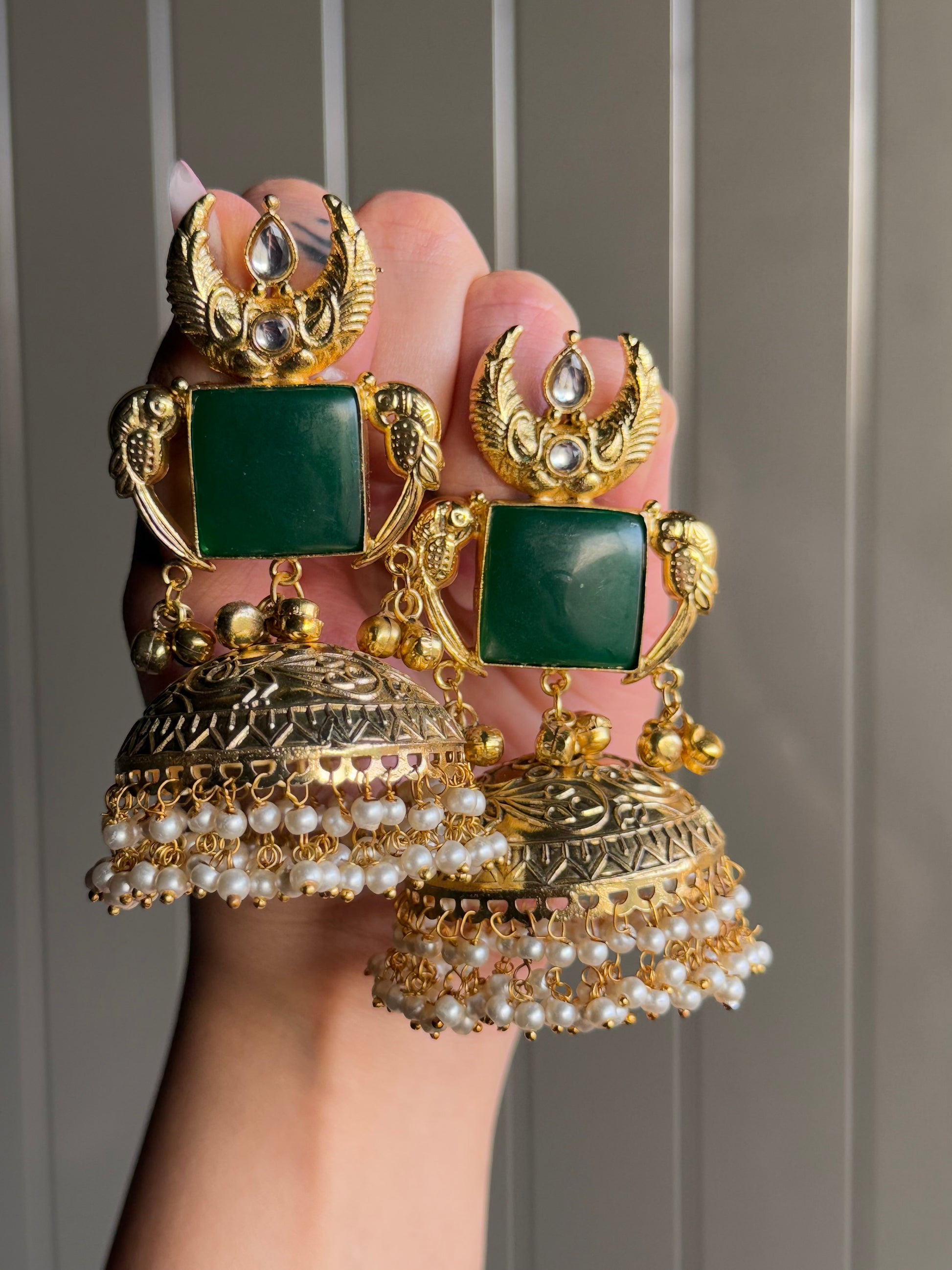 A masterpiece of heritage elegance, these grand earrings blend antique artistry with a regal touch. The bold green stone centerpiece is framed by majestic crescent motifs and kundan accents, symbolizing grace and prosperity. The intricately carved oversized jhumka base, finished with delicate pearl hangings, adds a rhythmic charm to every movement.