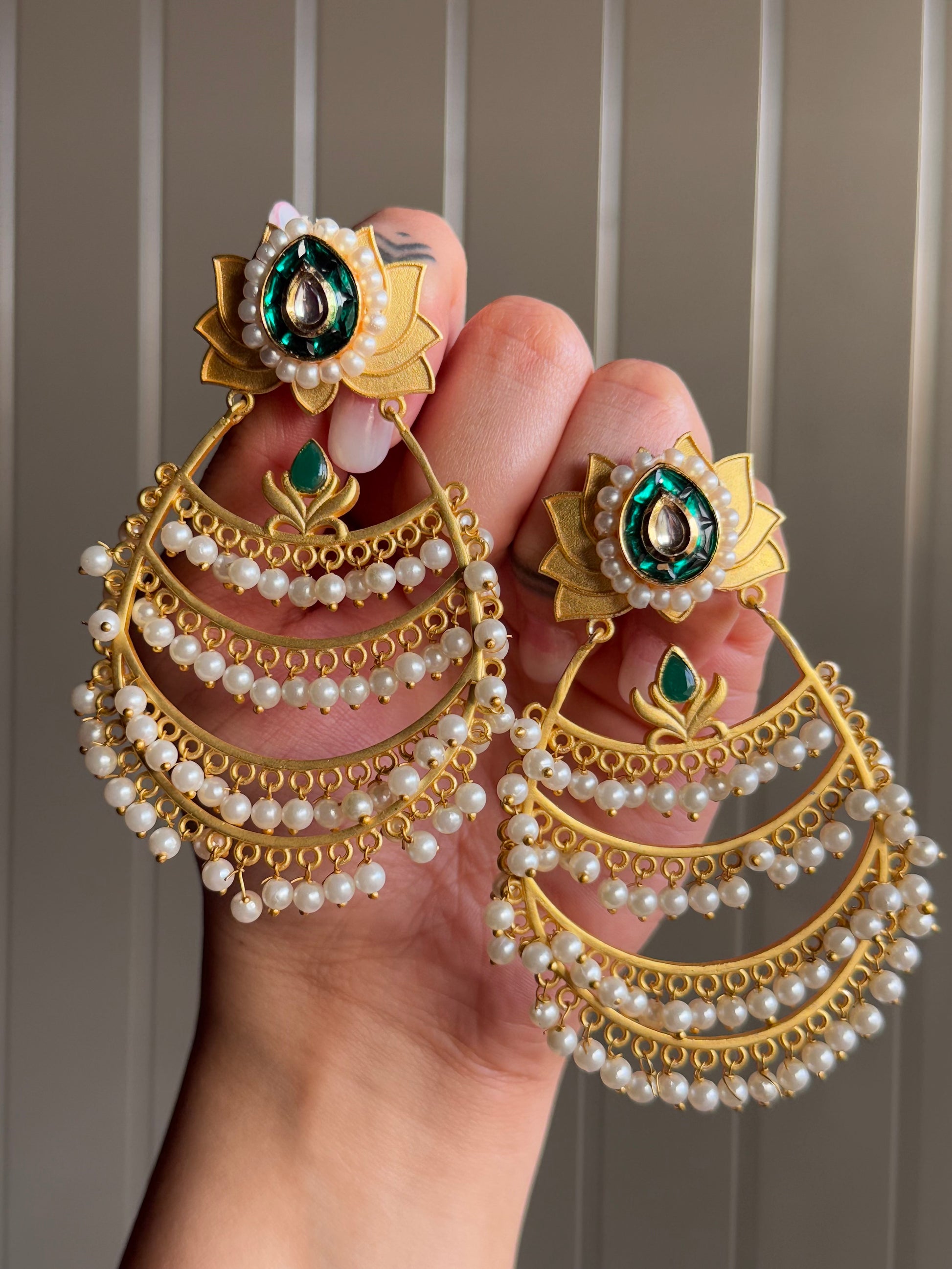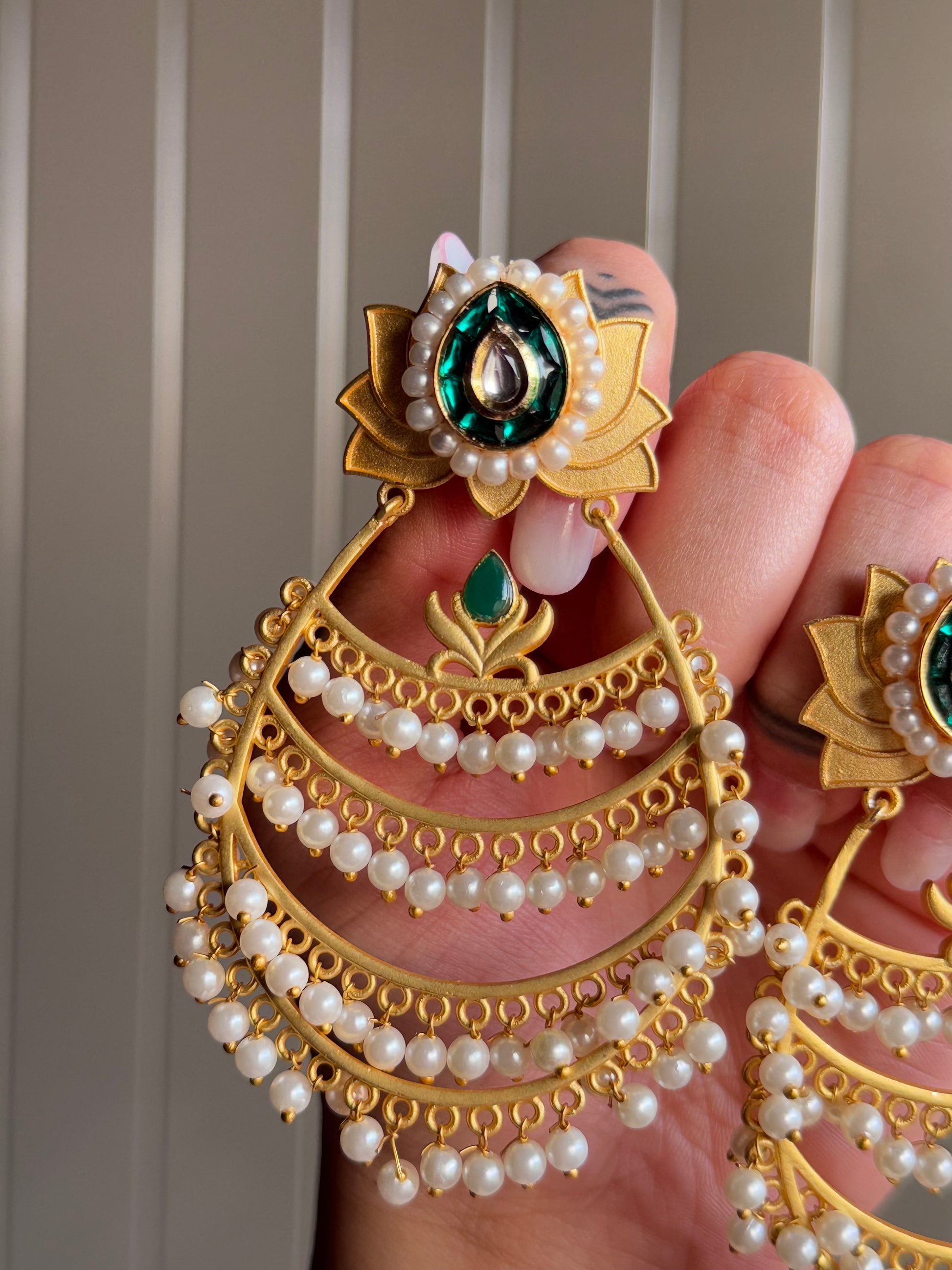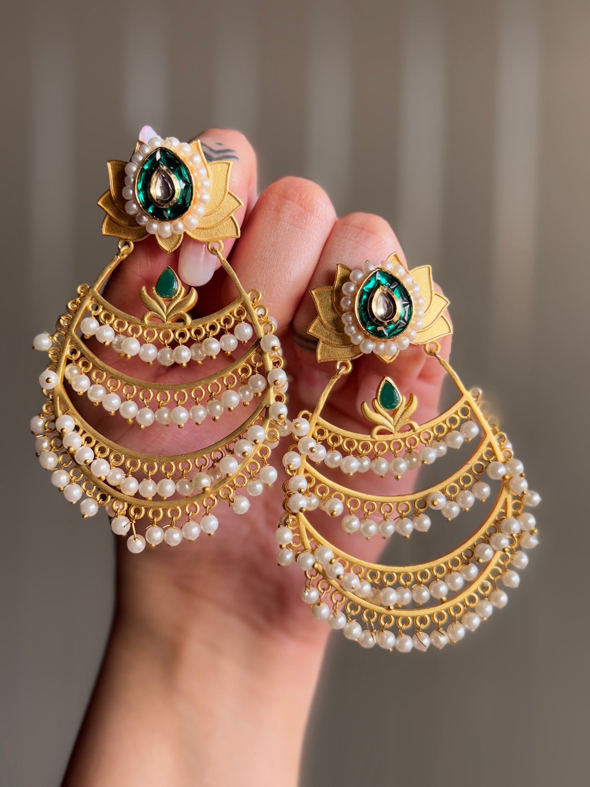 An exquisite blend of elegance and heritage, these earrings feature a graceful lotus-inspired stud with a deep green stone framed in pearls. The cascading arches adorned with delicate pearl strings create a fluid, harmonious design that mirrors the rhythm of classical Indian artistry.
