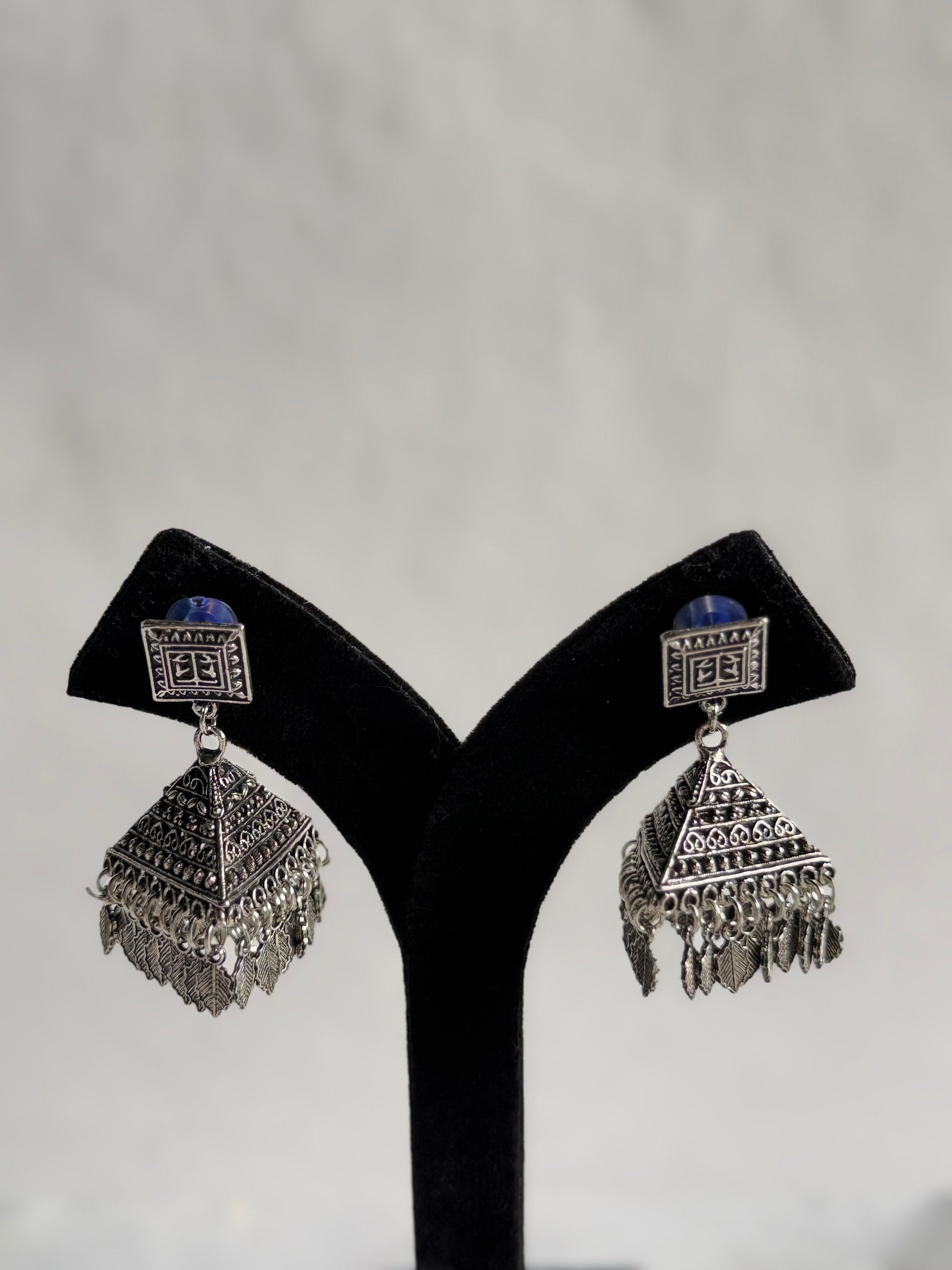 Step into timeless elegance with our Velora Earrings – a bold fusion of tradition and artistry. Handcrafted in oxidized silver, these earrings feature a temple-inspired pyramid design adorned with intricate carvings and dangling silver leaves, making them a statement of heritage and grace.