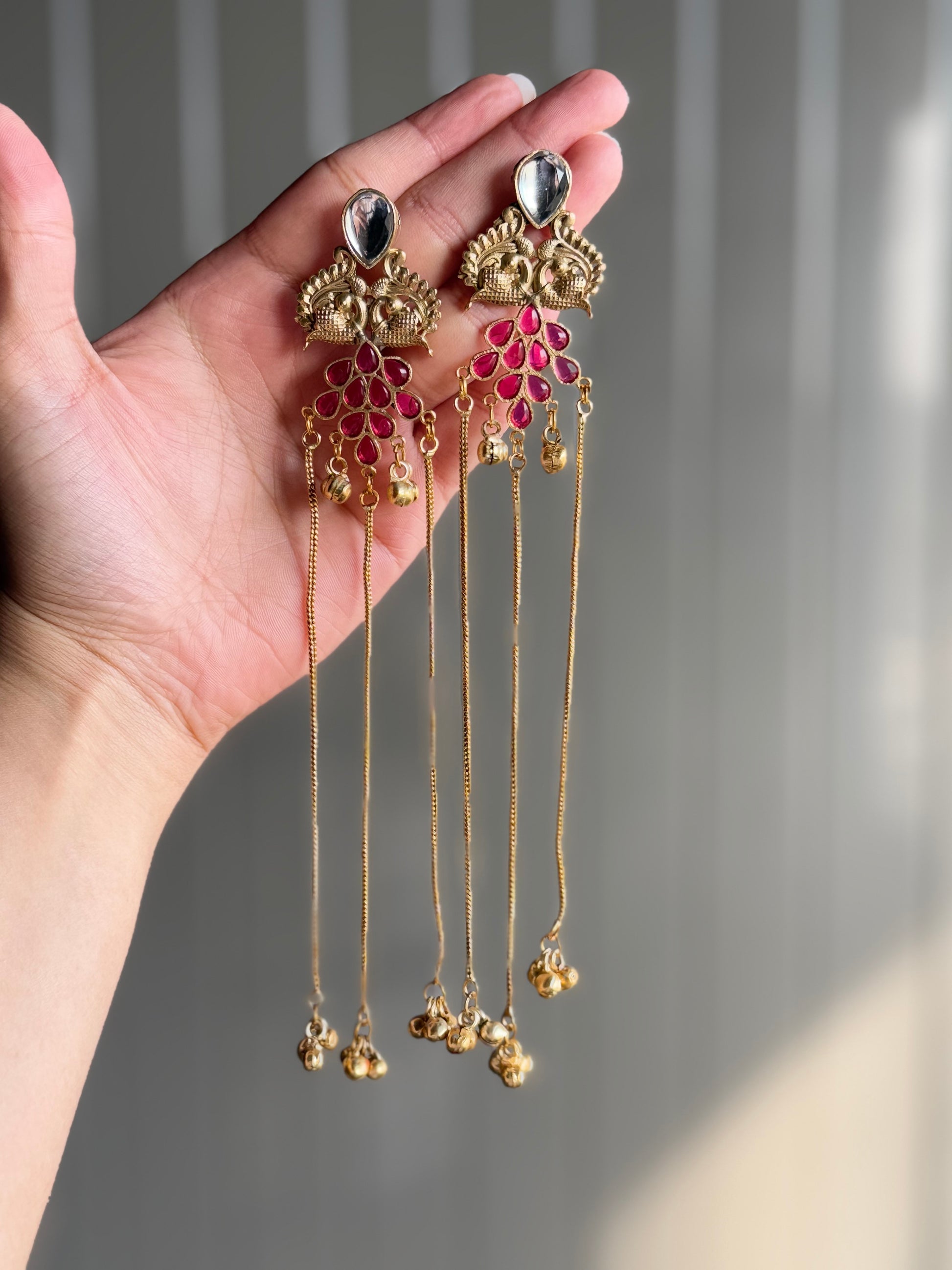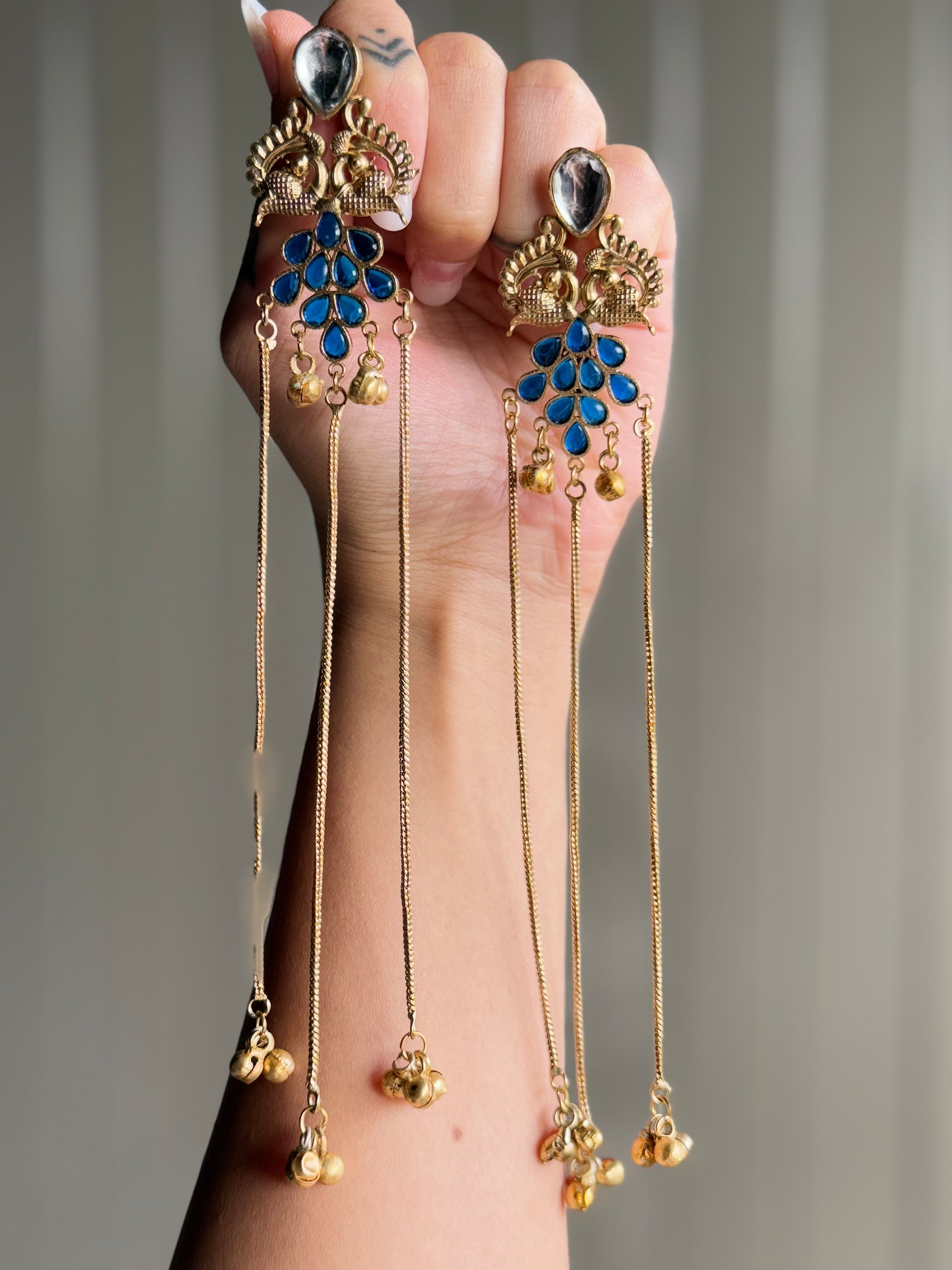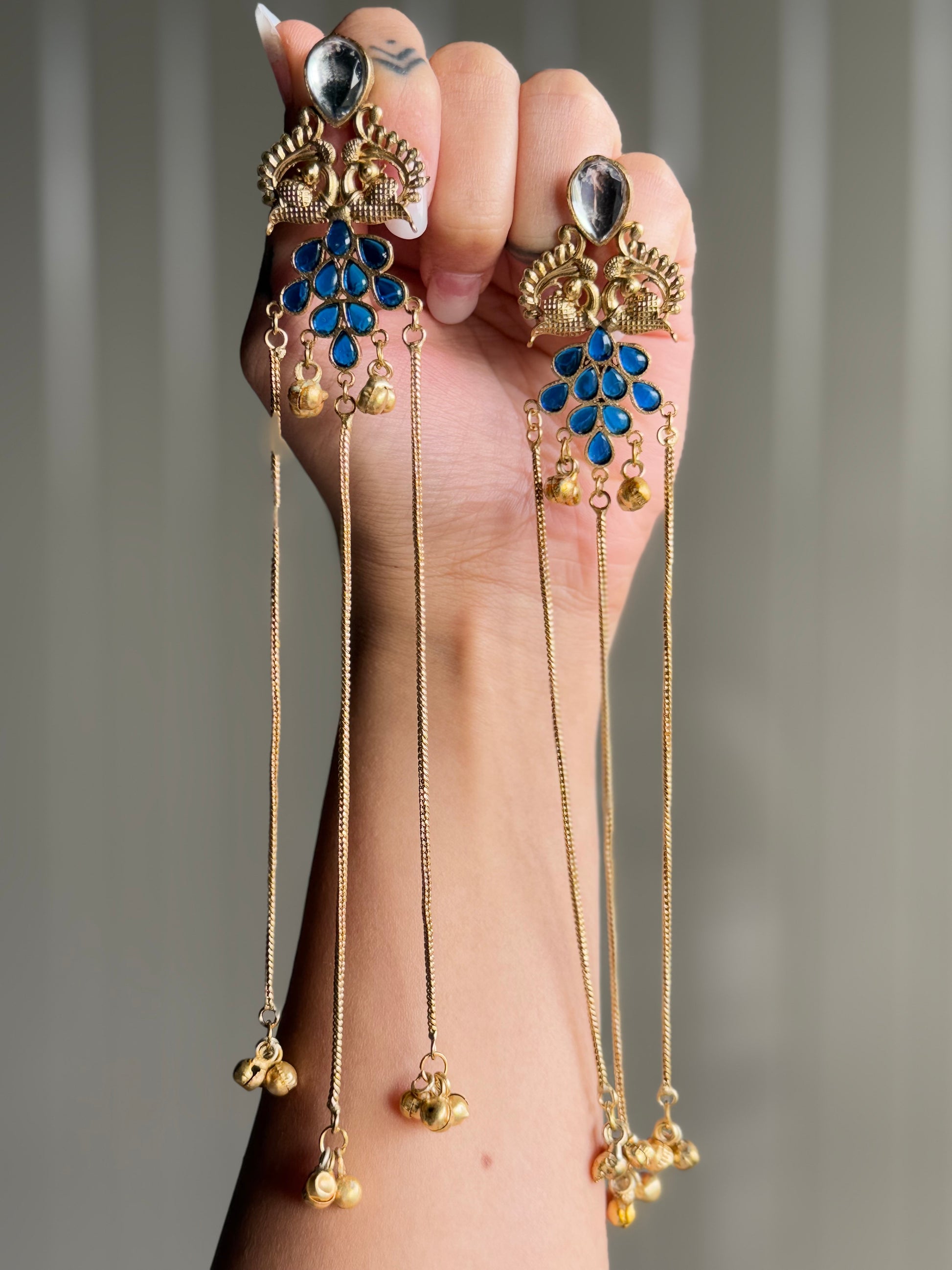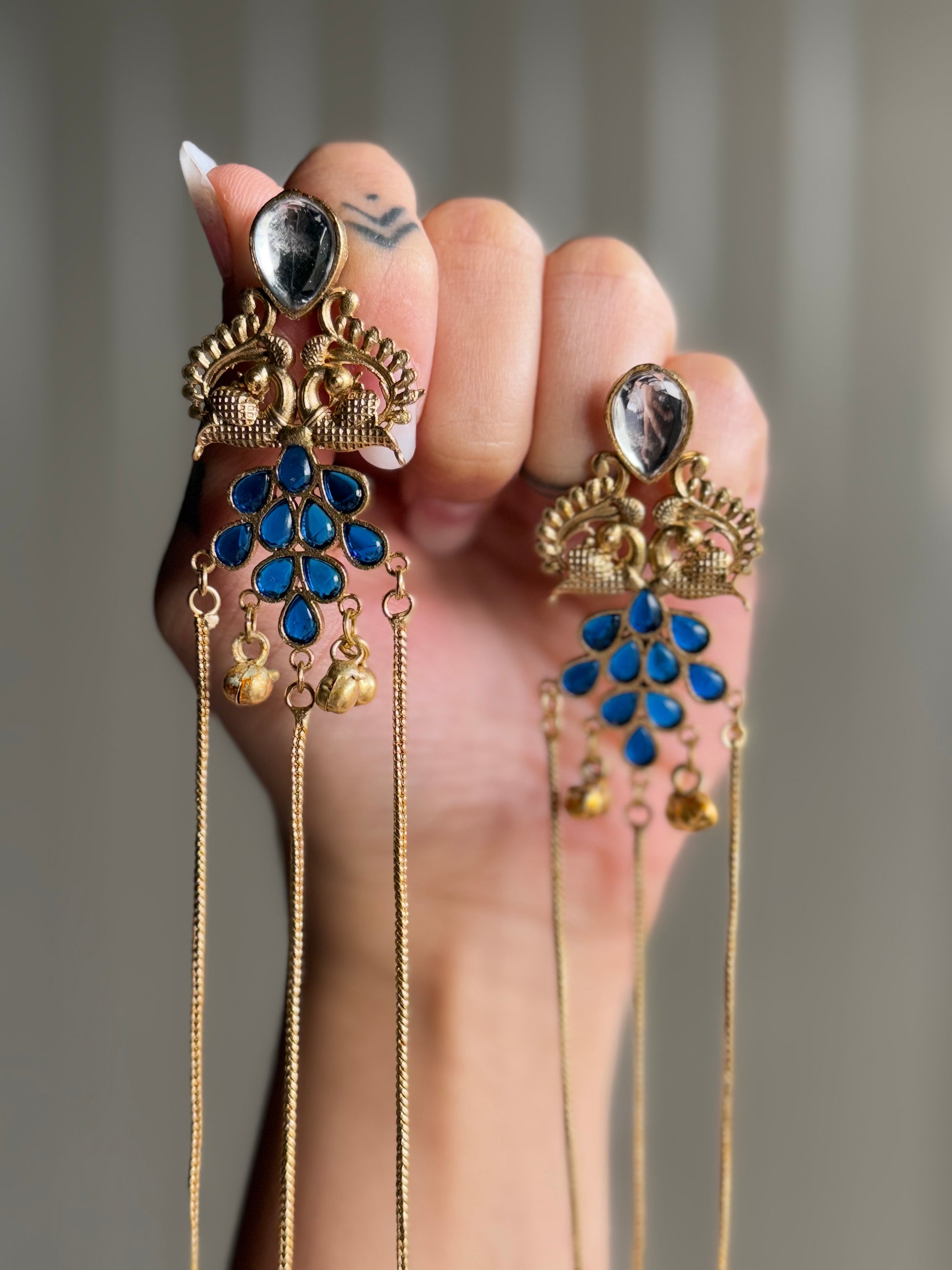 The Veyra Earrings are a vision of elegance, combining royal blue and pink accents with timeless golden craftsmanship. With a bold peacock-inspired motif at the top and cascading chains that flow gracefully, these earrings exude heritage charm with a modern touch.