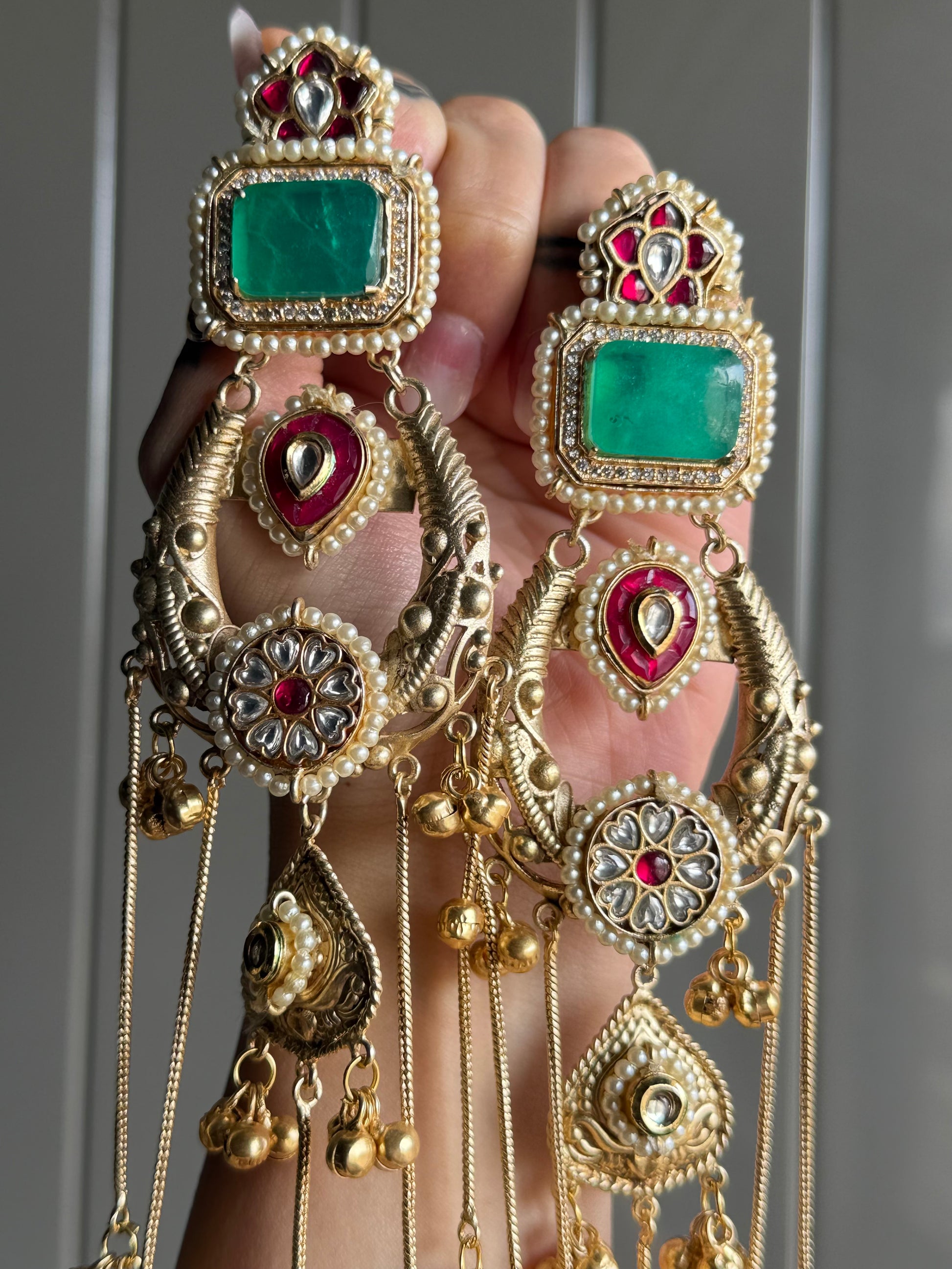 Step into the opulence of tradition with Mehira Earrings, a celebration of timeless heritage and grandeur. Crafted with an enchanting emerald green stone as the centerpiece, these earrings are elevated with ruby-red accents, kundan detailing, and ornate motifs that flow into cascading chains adorned with pearls and golden ghungroo drops.