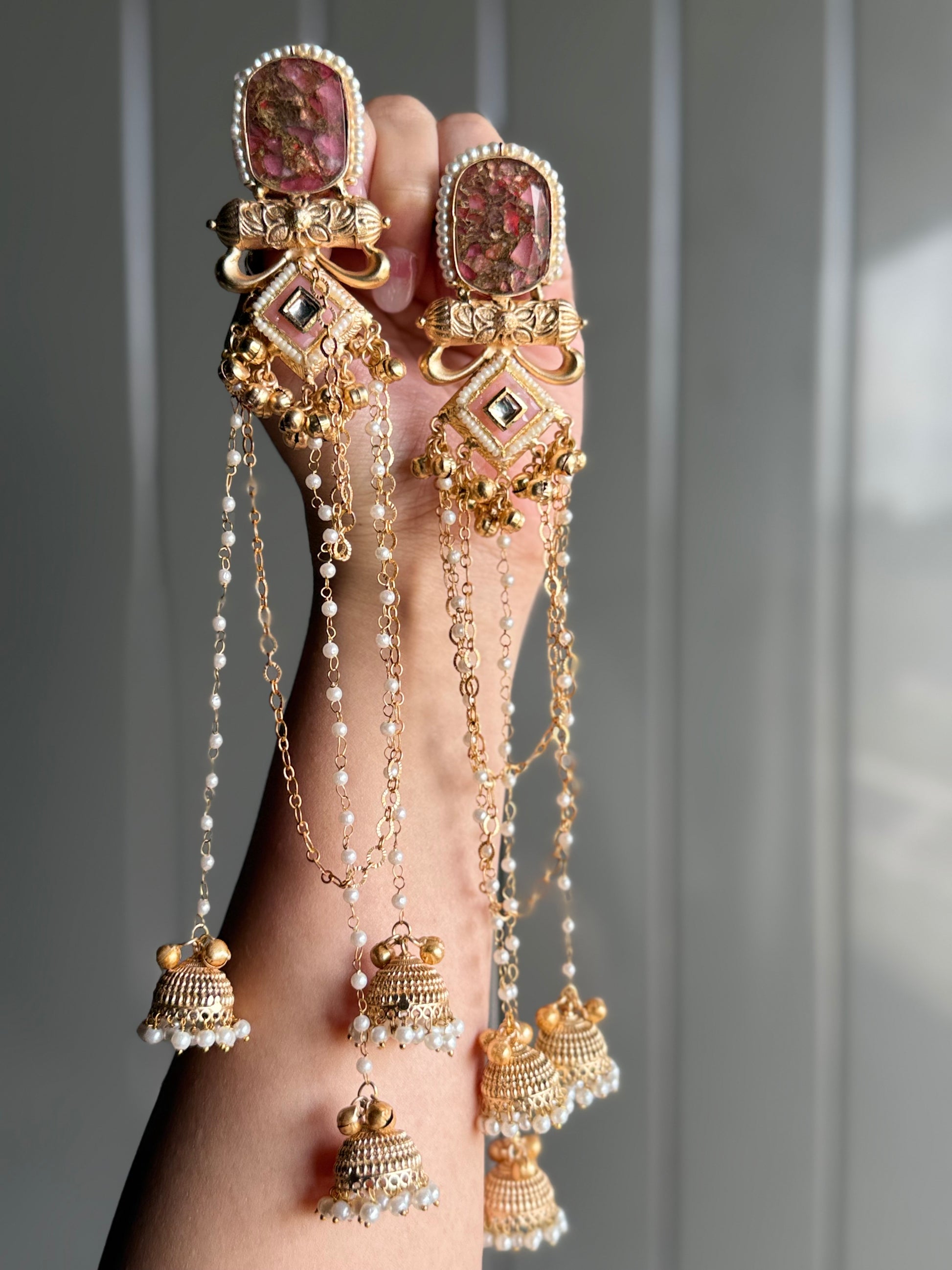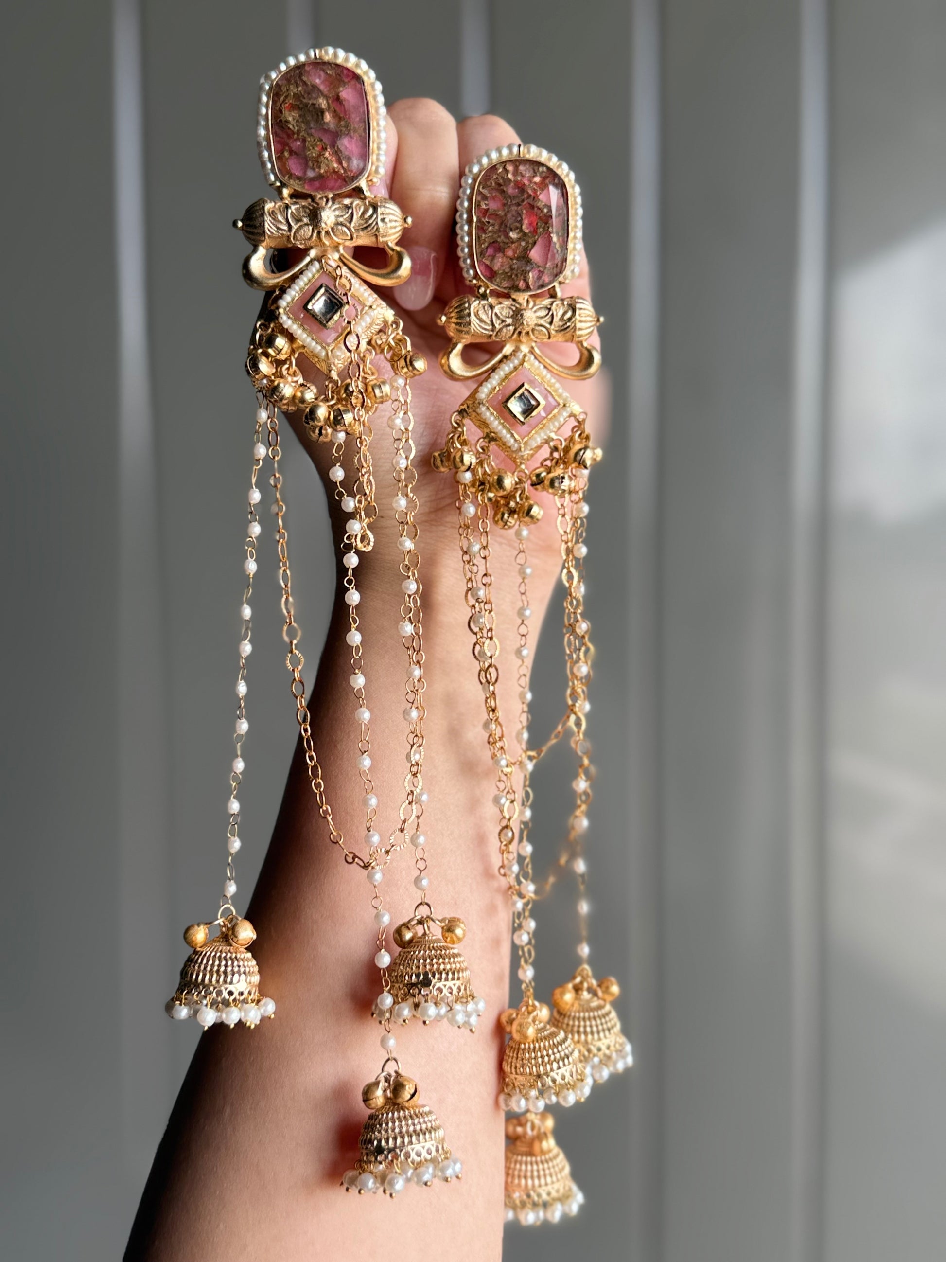 Step into timeless grandeur with Virasat Jhumka Drapes, a pair of earrings that carry the soul of tradition and elegance. Crafted with regal pink stone tops bordered by delicate pearls, these earrings cascade into layers of chains, accentuated with intricate golden jhumkas and dainty pearls at the ends.